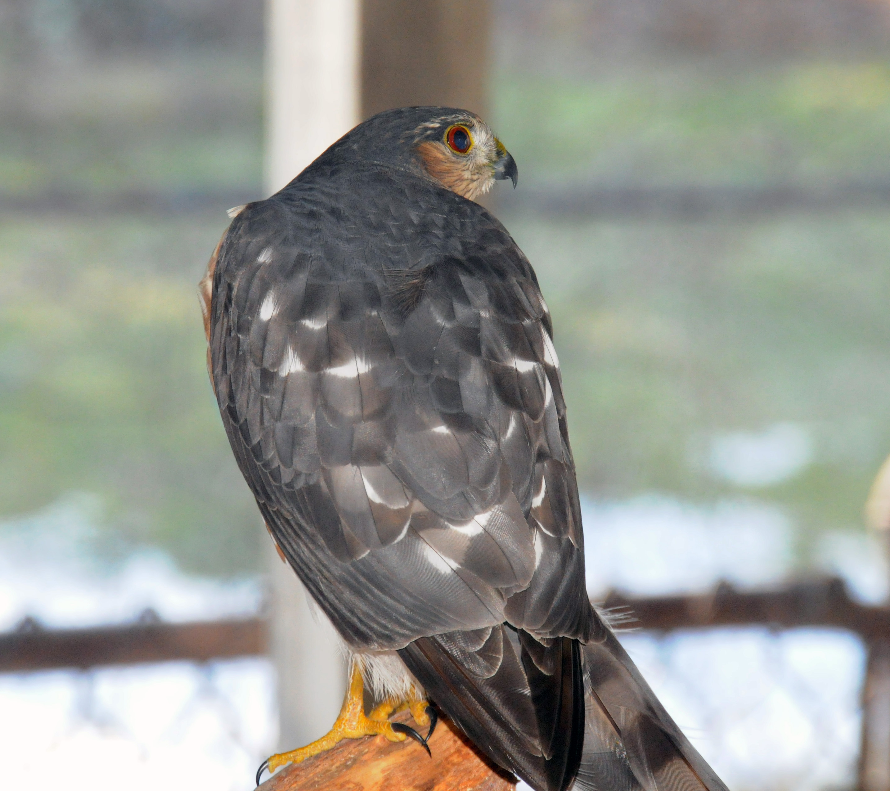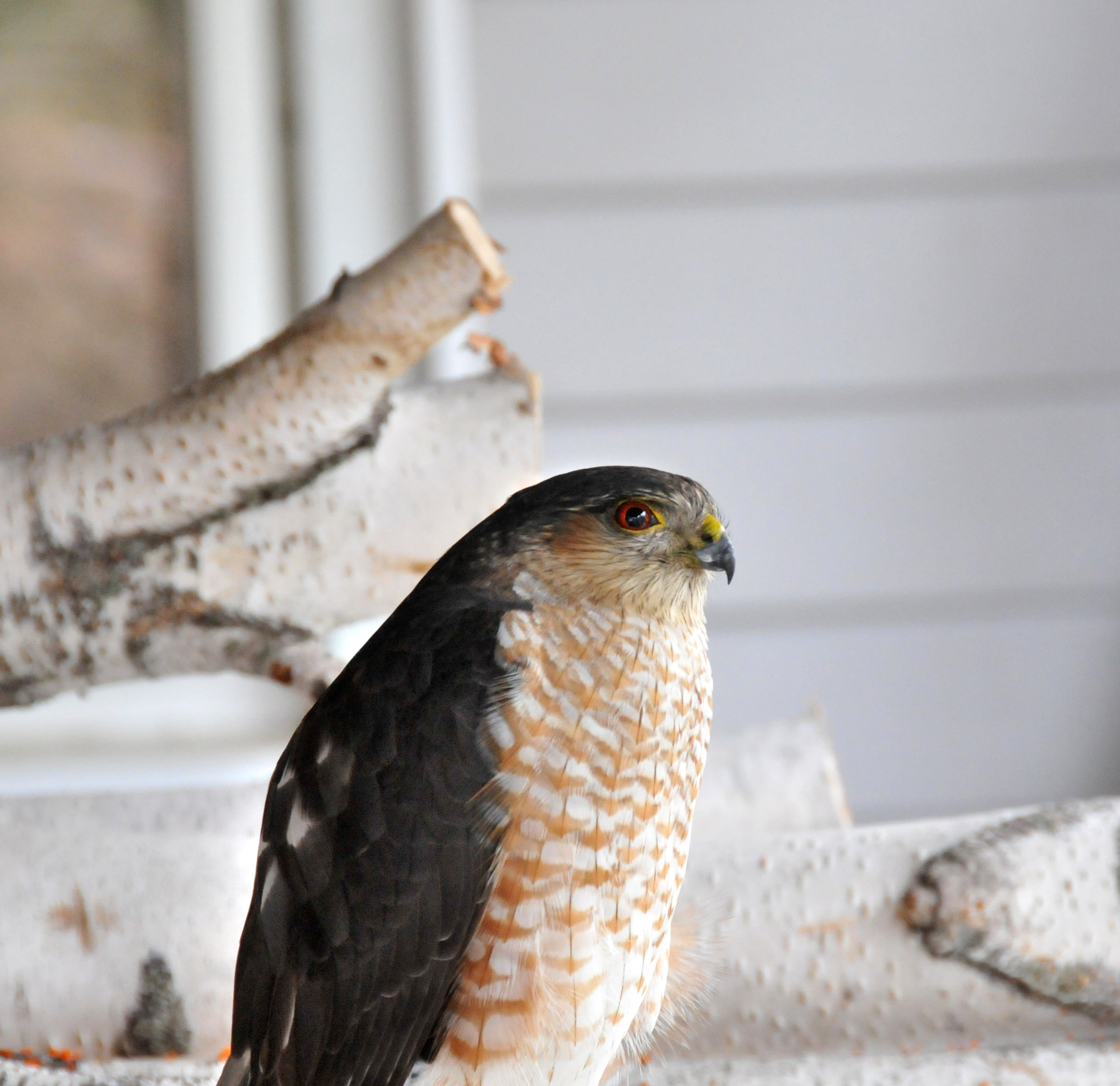 That’s the nickname of our residence Cooper’s Hawk. We considered other nicknames briefly, Howard Hawks; Hudson Hawk, perhaps Danny Aiello’s least proud film; Tony Hawk, but that last one was definitely beneath him. ‘Shorty’ fit the best for someone about the size of a loaf of bread. We can’t tell which gender so we have arbitrarily assigned “he” due to his majestic countenance. He has been with us since the winter 2008. I’m not sure exactly what drew him to us that winter, the warmth of the patio woodpile or plenty of food for him in the area. I noticed him one morning when I looked outside our bedroom window.