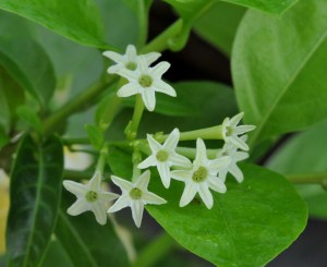 Night Blooming Jasmine, Cestrum noctumum, will broadcast its sweet scent from tiny pale green star shape flowers as soon as the sun goes down.  Its fragrance will linger until early in the morning before it fades away in order to start over again in the evening.