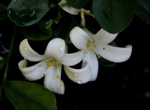 Jasmine is not the only fragrant tropical flower that perfumes our garden, Gardenia, Orchid, Night Blooming Jasmine, Sweet Almond Verbena, and Orange Jasmine do their share as well.   I grow Sweet Almond Verbena, Aloysia virgata, because it smells like sweet incense.  I guess it’s not just me that can relate its scent to incense since it’s also known as “Incense Bush”.  When I first saw it in the catalog, I could smell it in my memory.  I had to have it.  Yes, I ended up with two of them.  I will not be able to let them grow as big as the ones at my parents house, but two little bushes will do the trick.  The clustered tiny little white flowers have never been without insects on them, especially bees.  I don’t have to get my nose close to the flower.  I can smell this sweet incense when I sit on the pool deck any time there is a light breeze.