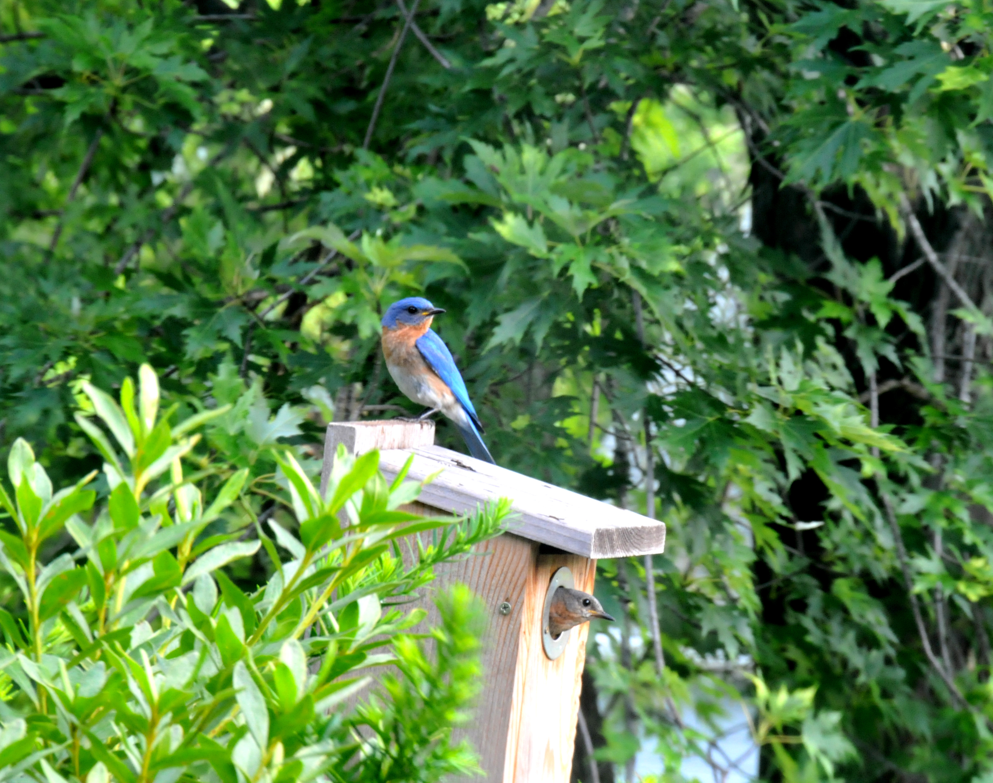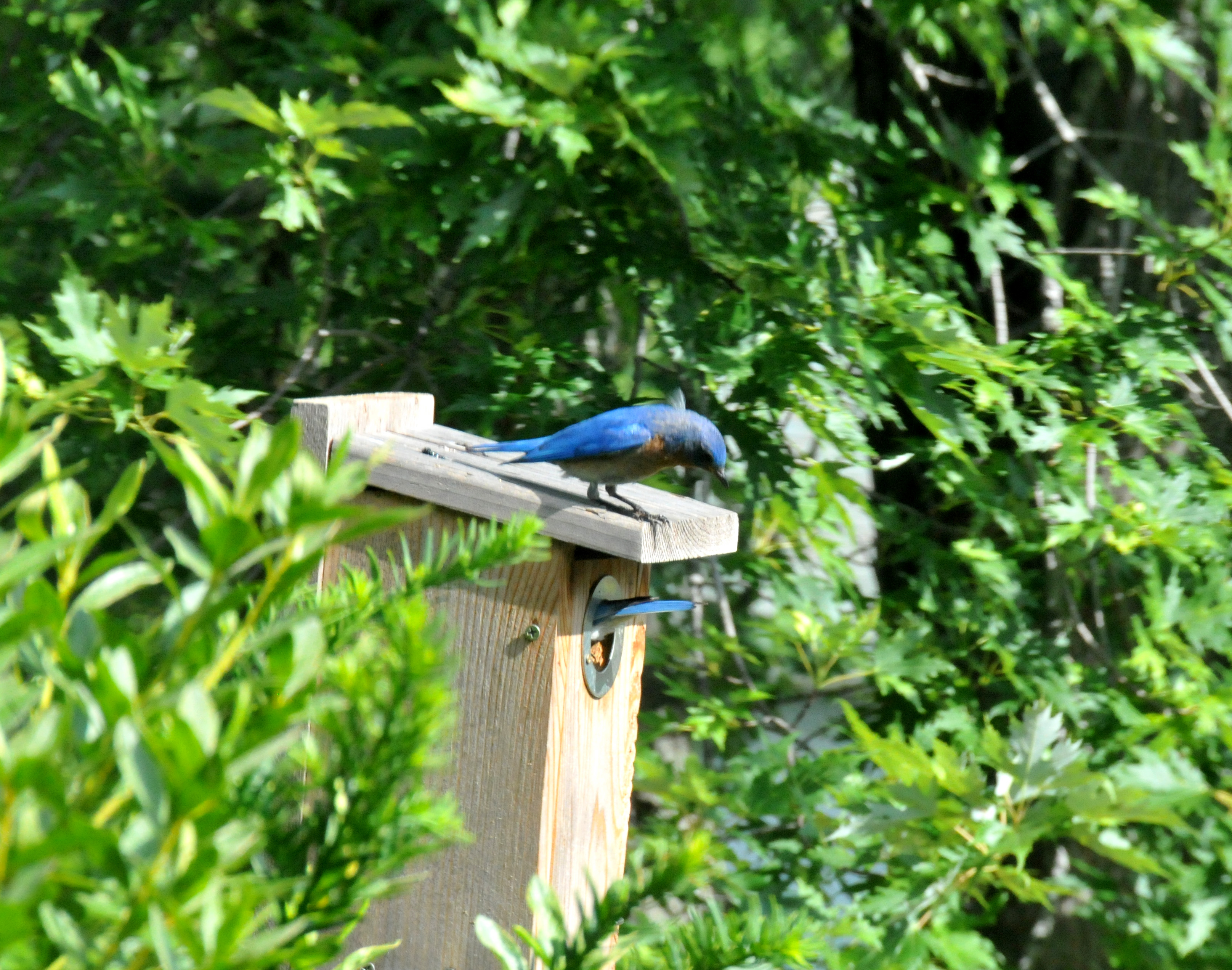 We love all song birds. But after I saw my first real-life Bluebird preening on a tree trunk along the bike path I was awestruck. A beautiful blue with rust colored chest and white belly. The thought of drawing them in to reside in our garden popped up in my head. I read all books and articles I could find about them. I bought a couple of birdhouses that were made specifically for Bluebirds, but we had failed to draw them in for the past two years. They came, looked and decided against staying. At least once they were chased away by the House Sparrows. One time they were bombarded by the Tree Swallows who already built their own nest in the house near by. One of the books about Bluebirds mentioned that they can be good neighbors, but I guessed these pairs were exceptions.
