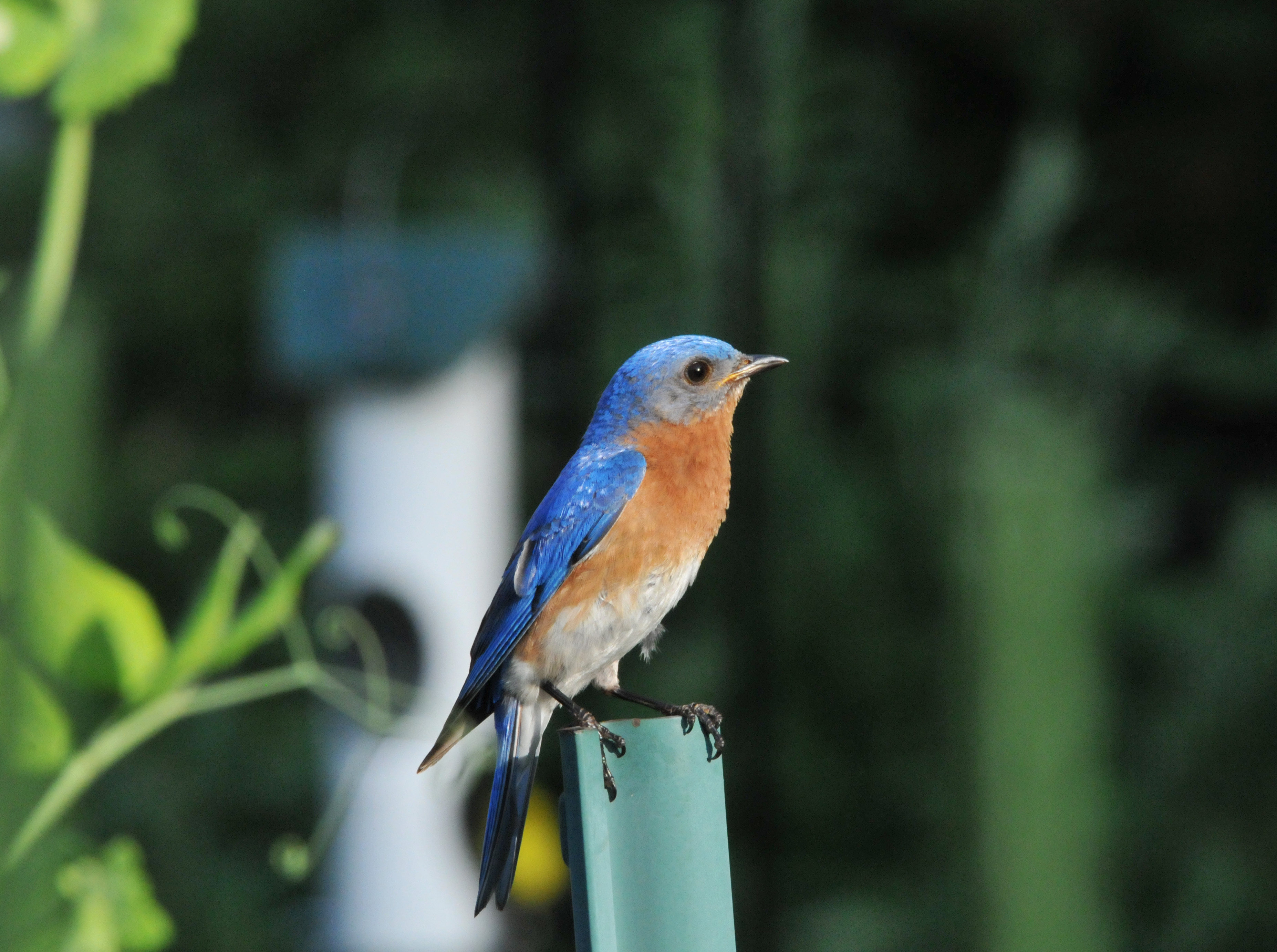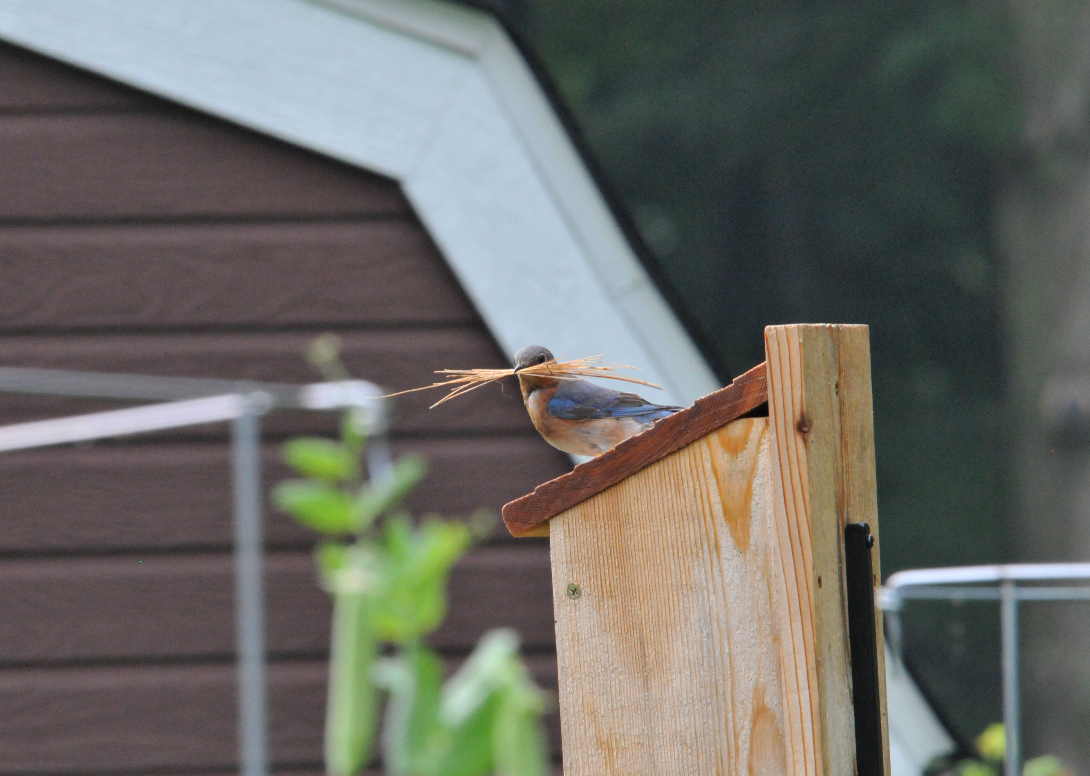 A second family of Bluebirds came to check on a nest box at the corner of the vegetable garden a few weeks ago. Then they decided to build a nest. We were so happy that this year we will have two Bluebird families raising their chicks in our garden. I kept my eye on them whenever I could to make sure that the House Sparrow didn’t take over the nest box. I saw her diligently bringing in nesting material while he kept his eyes on the predators and menace. Both of them helped to pick off insects in the vegetable garden when they’re not busy with nest building.