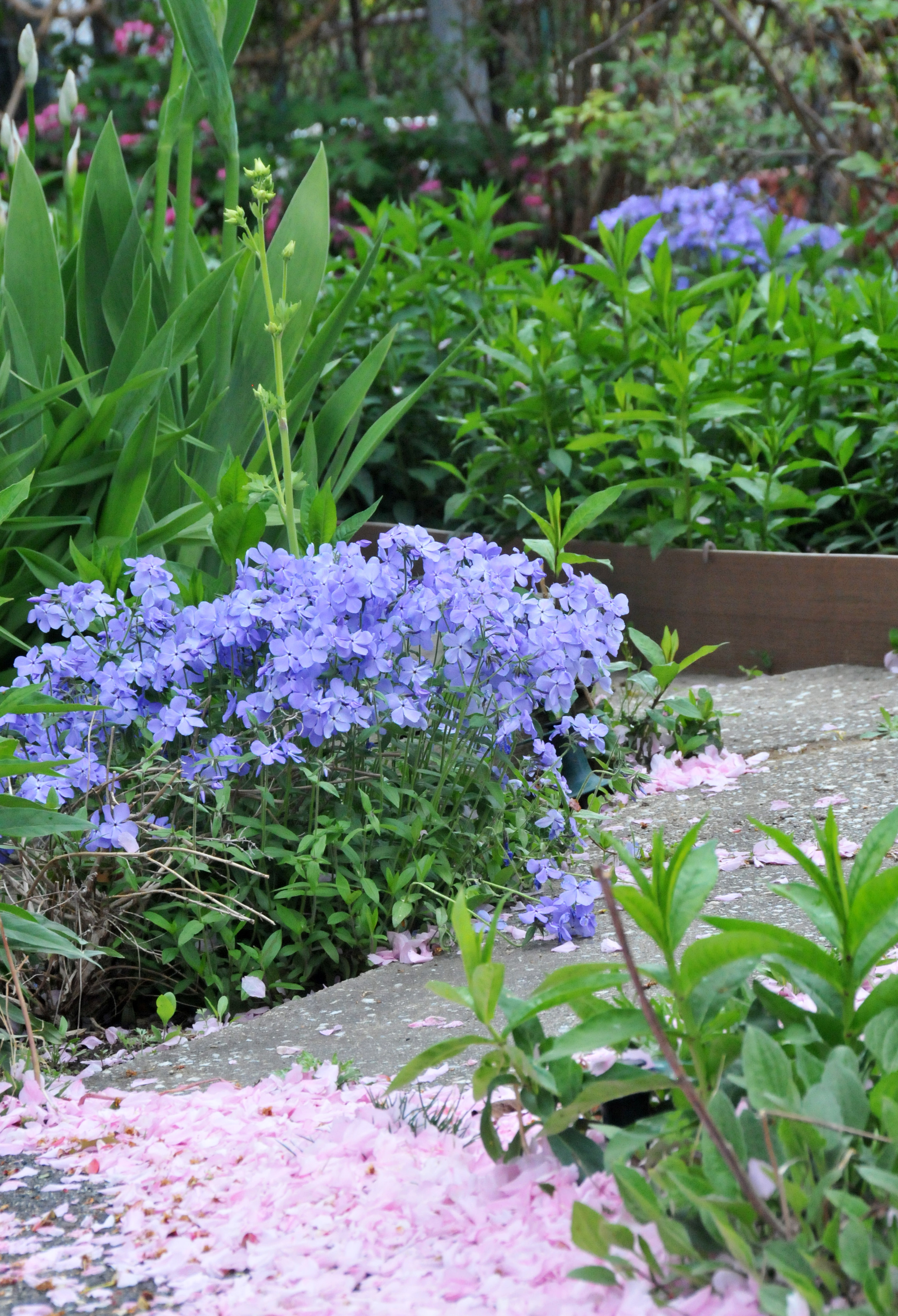 Your photos are nice. The lush green against the blue phlox along with the pink cherry blossom petals is soothing.