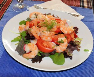 Put salad on the plate, top with the shrimp you just mixed. Decorate with dill. If you have any liquid left in the bowl, pour it over the salad. Done!