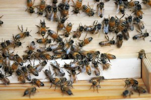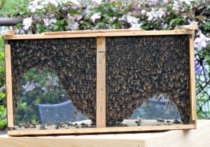 Next, the nerve-wracking part…putting the bees in the hive. Following directions, I had already poured sugar water on them in the cage. I was hoping that it might make their wings stick together enough to keep them from flying off. All the books I’ve read and the DVD that came with the kit said to smack the bee cage to round the critters into one clump, then turn the cage over and pour them into the hive. Easier to read and watch than to actually do it. The first clump dropped in but a lot of bees were still hanging in the cage. In the mean time they were flying all over the place. I decided to smack the cage on top of the hive one more time then left the cage next to the hive. I thought they could find their own way out. I closed the hive and walked away.