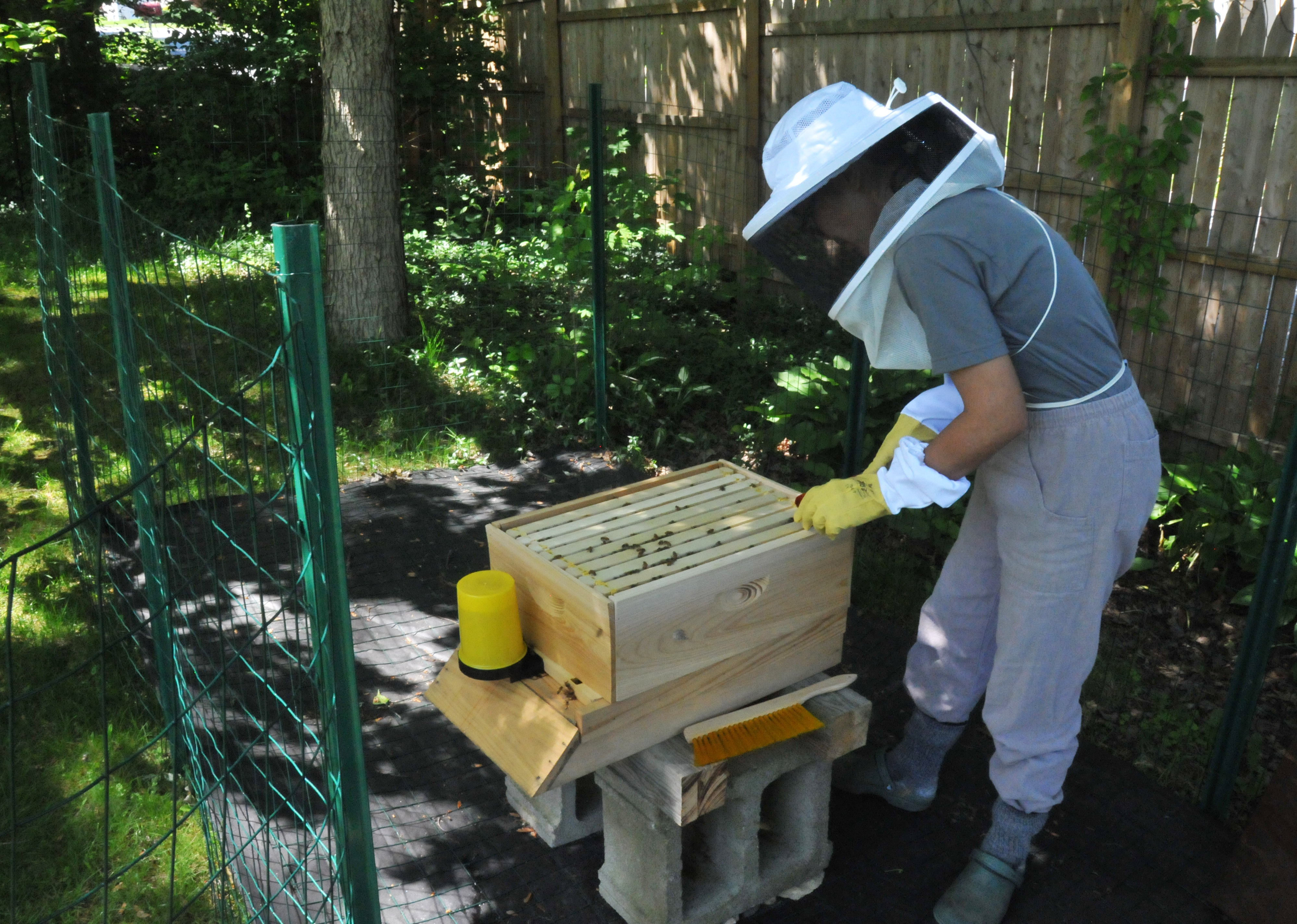We did the first inspection of our hive today. It was a little late. We were supposed to inspect it in a week after we set up a new hive, but we let it go for a week and a half. We wanted to do it within the time frame of one week, but either we came home after dark or the weather was bad. We’ve been checking on them every day, though. Actually, it has been more like feeding them everyday. We have gone through 15 pounds of sugar in a week and a half.