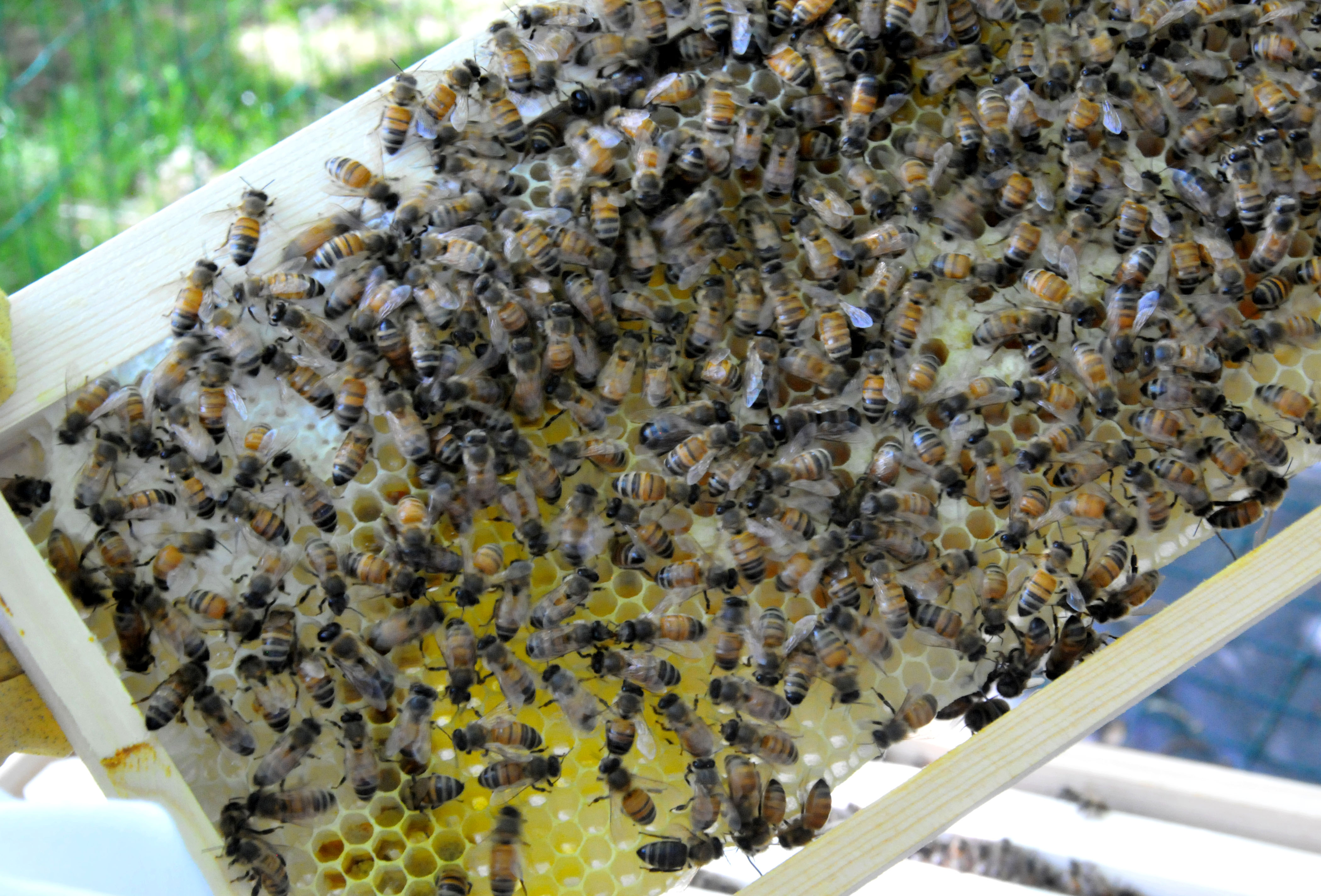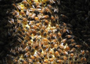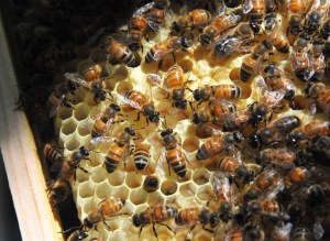 The cells in one of the frames were almost full with new brood larvae. Two more frames were half full and they had also started to fill some cells on the third and forth frames, outwardly from the middle. All eight frames have been worked on in various degrees. The cells were either sealed, or filled with larvae and sugar syrup. This is good news for us in that we know the queen is hard at work reproducing and the workers are doing their job.