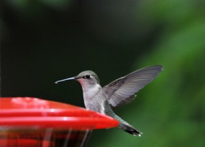 I put the hummingbird feeders out as soon as the columbine started to bloom. I have to put them far apart since the birds are very possessive about their feeder. Even after they’re done with the sugar water, they still keep their eyes on the juice and chase the interlopers out. For the first time this year I’ve seen two of them drink from the same feeder. I’m envious when I see photographs of many hummingbirds feeding from the same feeder or feeding from a person’s hands. I guess they put up with one another when they migrate and take what they can before taking off to their final destination. Northeastern US is their breeding ground, so they get very territorial.