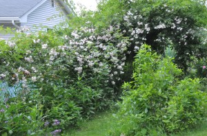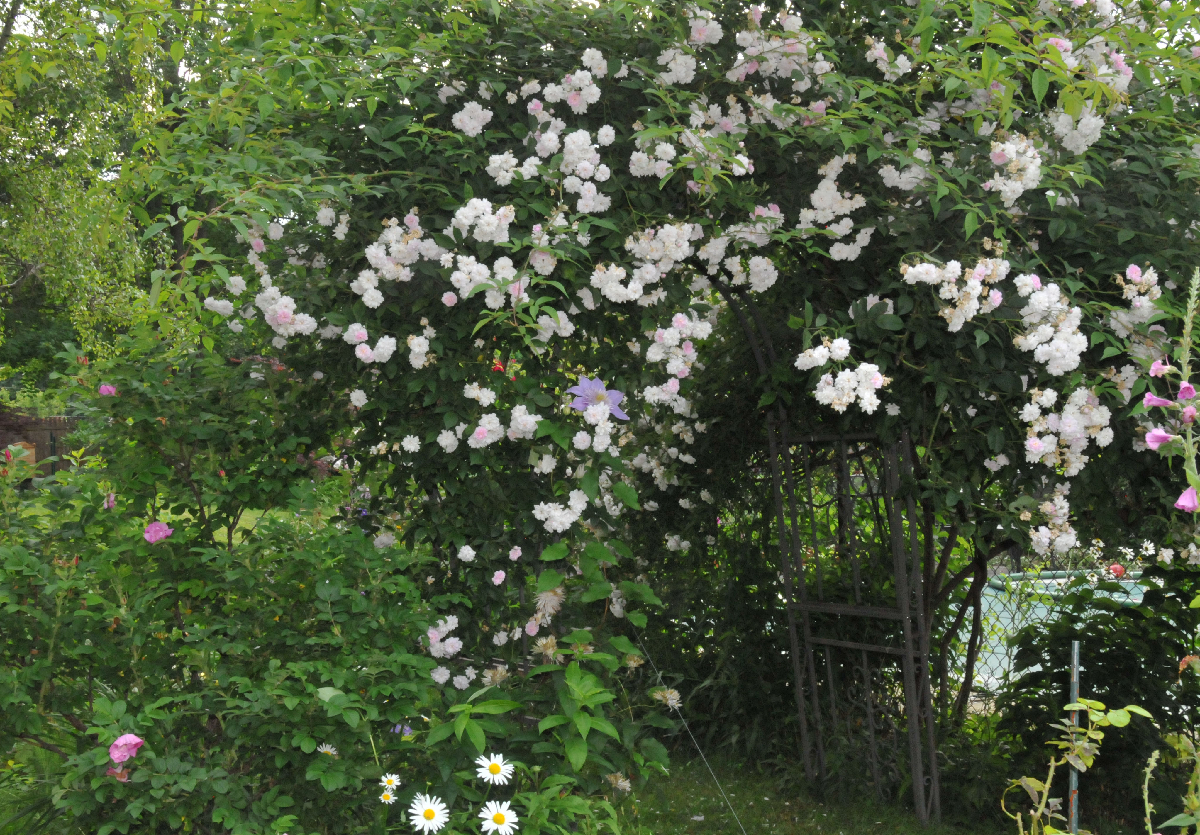 We came back from vacation just in time for the Paul’s Himalayan Musk bloom. It would have been a tragedy to miss it since it blooms only once a year. The garden is covered with a honey scent, especially when the temperature is a little on the cool side. I did give it a hard pruning early in spring, before the leaves unfurled. It still grew back to cover its trellis and part of the pool fence as well. Once it blooms, all the pushing and shoving their way through the garden is forgiven. My guilty conscience set in too, so I let it grow. I will have to give it a crew cut again once the flowers fade. But I’ll leave some to develop rose hips for the birds.