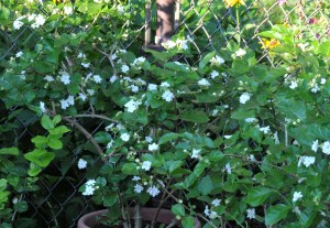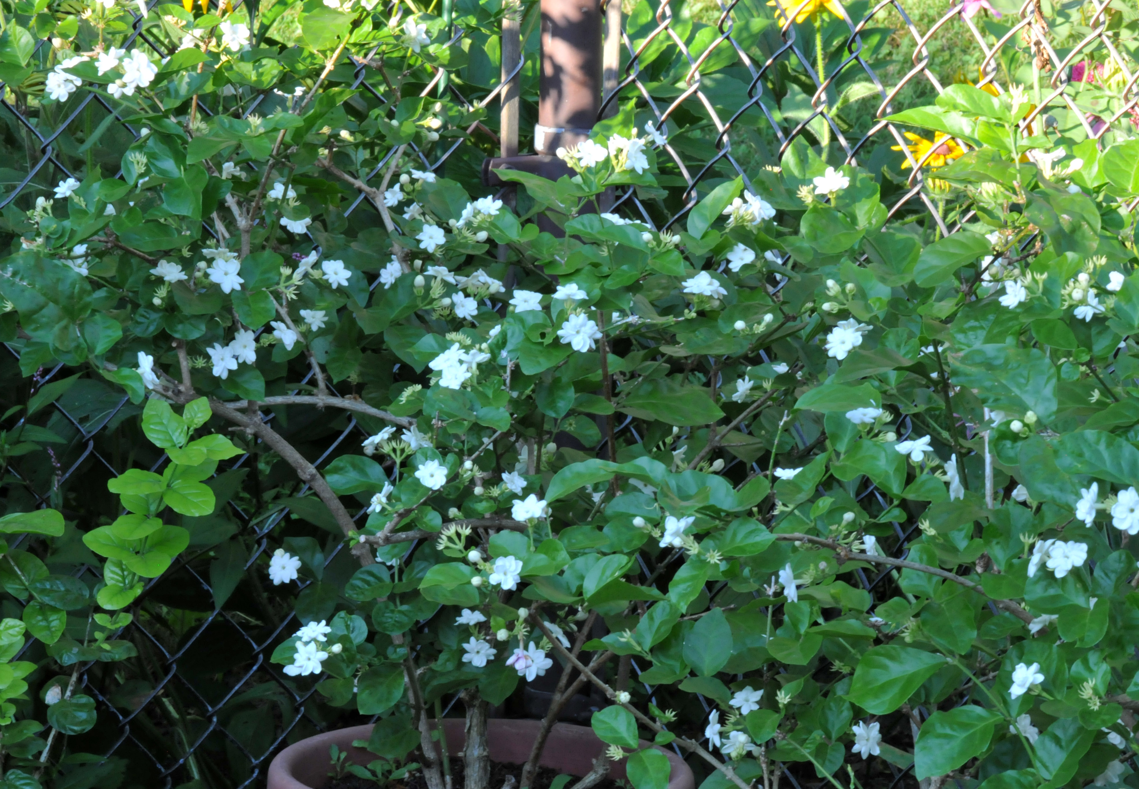 It’s that time of year again, when our Jasmine blooms profusely. They perfume the garden in the evening and early morning. I line them up on the pool deck where they can get full sun and are easy for me to collect the flowers. The Jasmine “Maid of Orleans” (Jasminum sambac) are the ones that bloom before any other jasmines I grow. They bloom throughout the year but only sporadically when we keep them inside. I don’t blame them since they only get to enjoy outside sunshine and heat for a few months out of the year. But they are nice enough to produce flowers even when they are cooped up in our basement under artificial sunlight.
