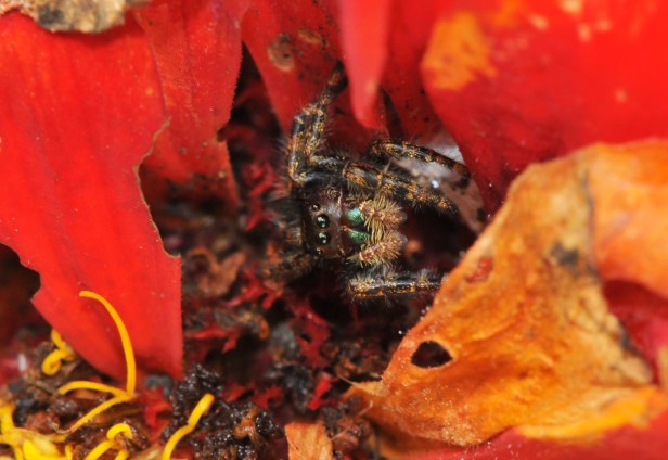 I went outside this morning to enjoy the quiet and fog.  I have always liked fog, but in the garden only, not on the road.  Fog gives the garden a sense of peace, quietness and stillness…a Zen moment.  I walked around to check on the plants and the damage the deer have done.  I knew there were a lot of spider webs in the garden, I have walked through them countless times, but this morning I could really see them.  The mist from the fog was hanging on to the spider web silk like a crystal necklace.  Some of them looked like sparkling glitter that the spiders threw on the plants at random.  It’s a lovely Halloween setting, except for a spooky Jumping spider staring back at me from the Zinnia.  But really, she’s cute and trying to keep a low profile.