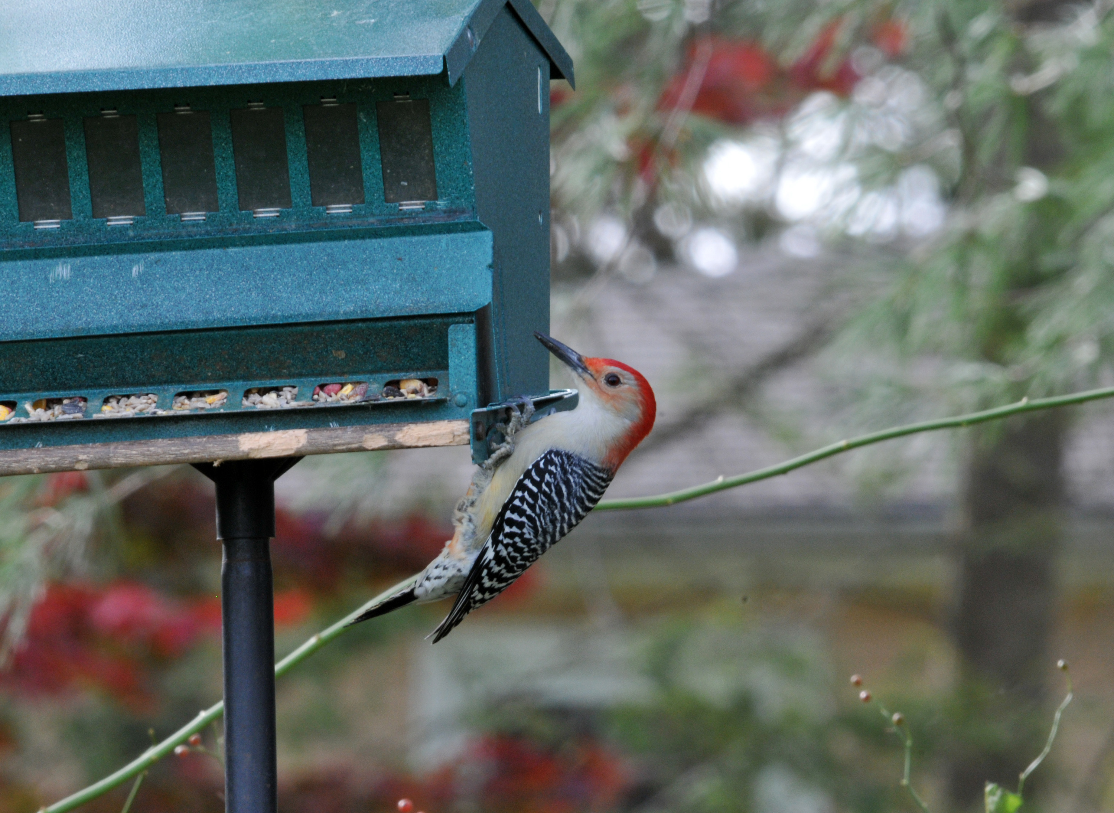Red-bellied Woodpecker (male) tried to figure how to get the seeds from the feeder.