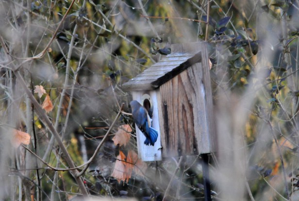 We have been housing Eastern Bluebirds (Sialia sialis) in our garden for a few years now.  They arrive in early spring and check out birdhouses around the yard for nest-building and raising their chicks.  In years past they would be gone by mid-autumn, but they never left this year.  After their chicks fledged this year, they’ve been hanging around and foraging for food in the garden.  I thought they would be gone by now, but I still hear their call from high up in the trees.  Lately, they’ve been coming around inspecting birdhouses again…but for roosting.