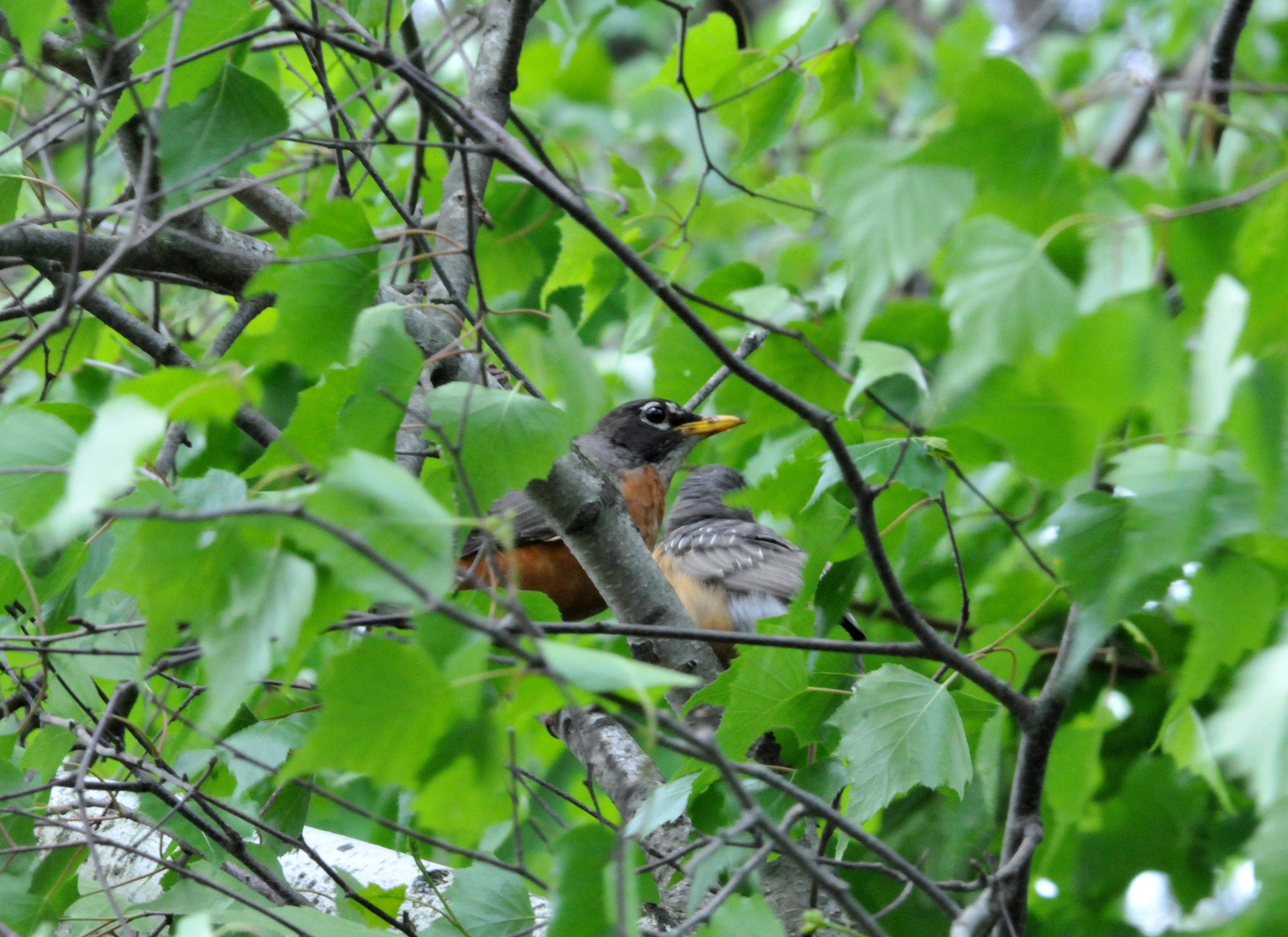 When we see the American Robin (Turdus migratorius) in the neighborhood that means spring is coming. A couple of pairs have nested in our garden each year. They help a lot by picking grubs off the lawn and gardens. Their first brood have all grown up now and they’ve already started a second one.