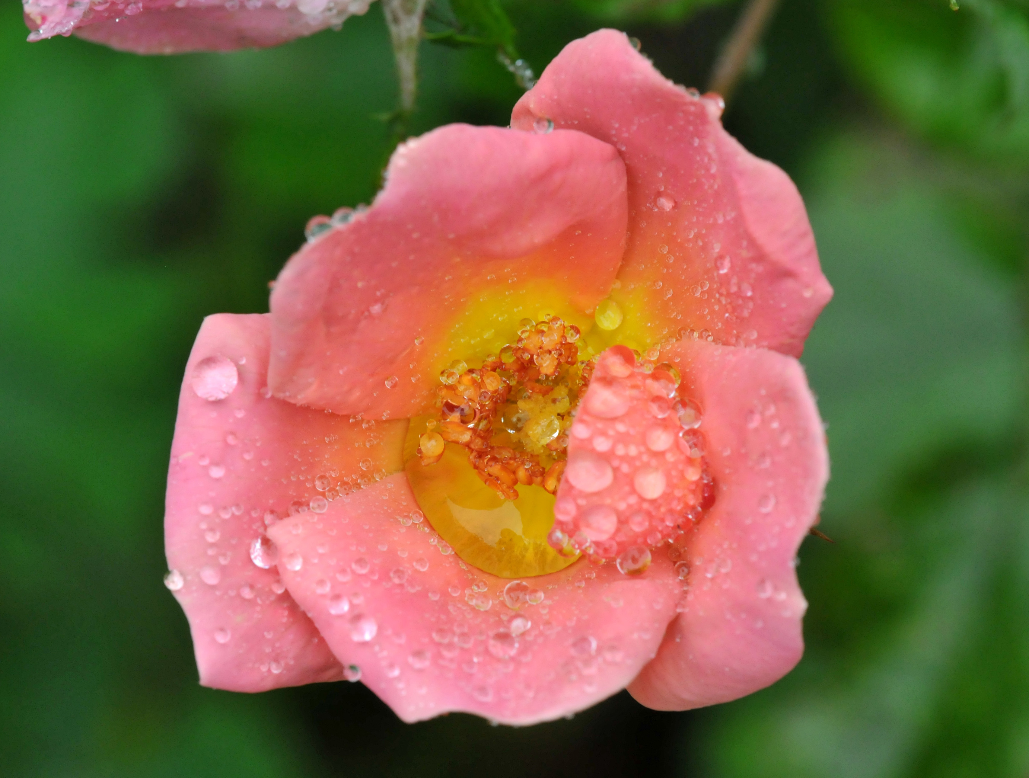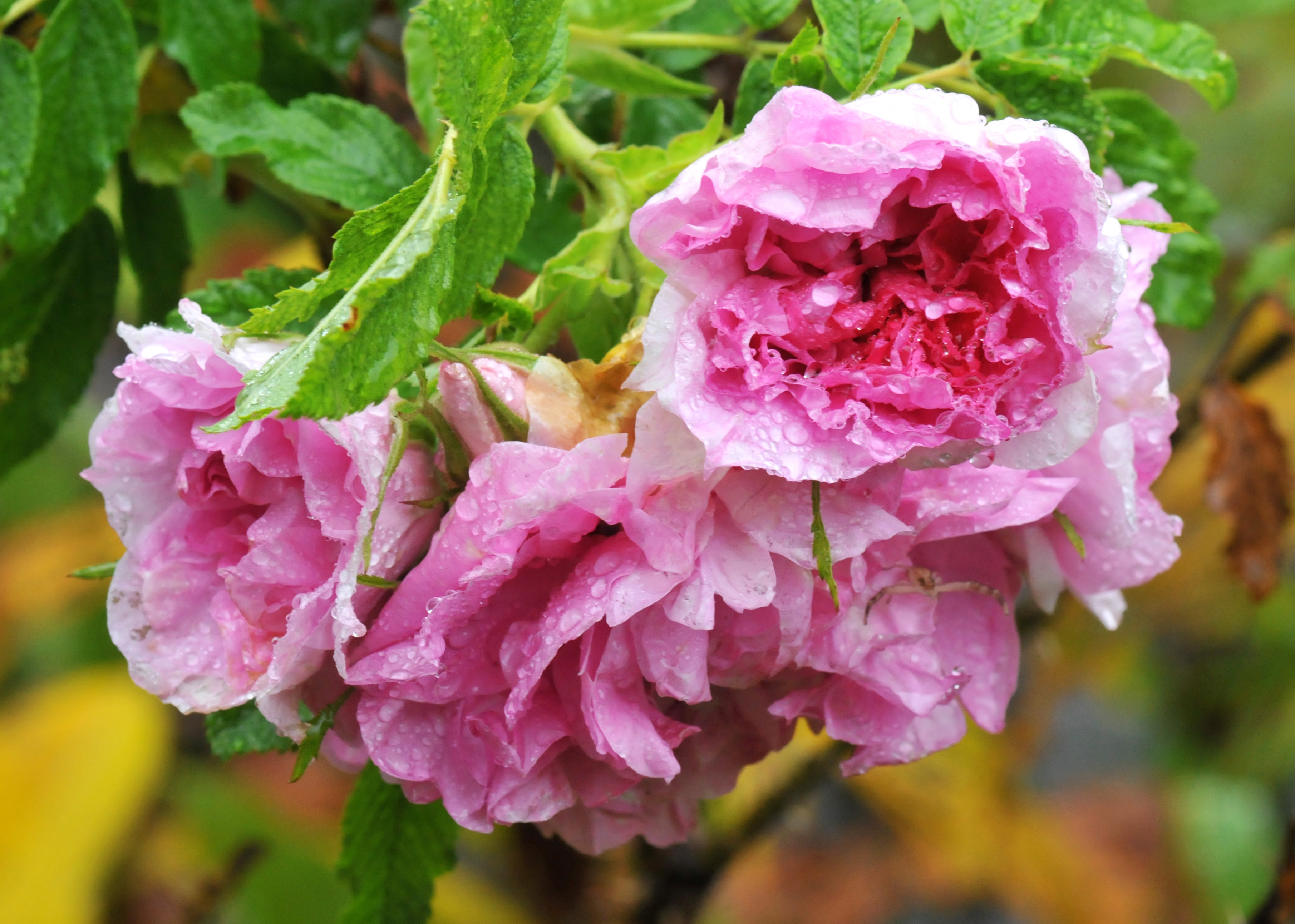 Rosa Rugosa ‘Ms Doreen Pike’ is still producing flowers here and there. This one is soaking wet from the rain.