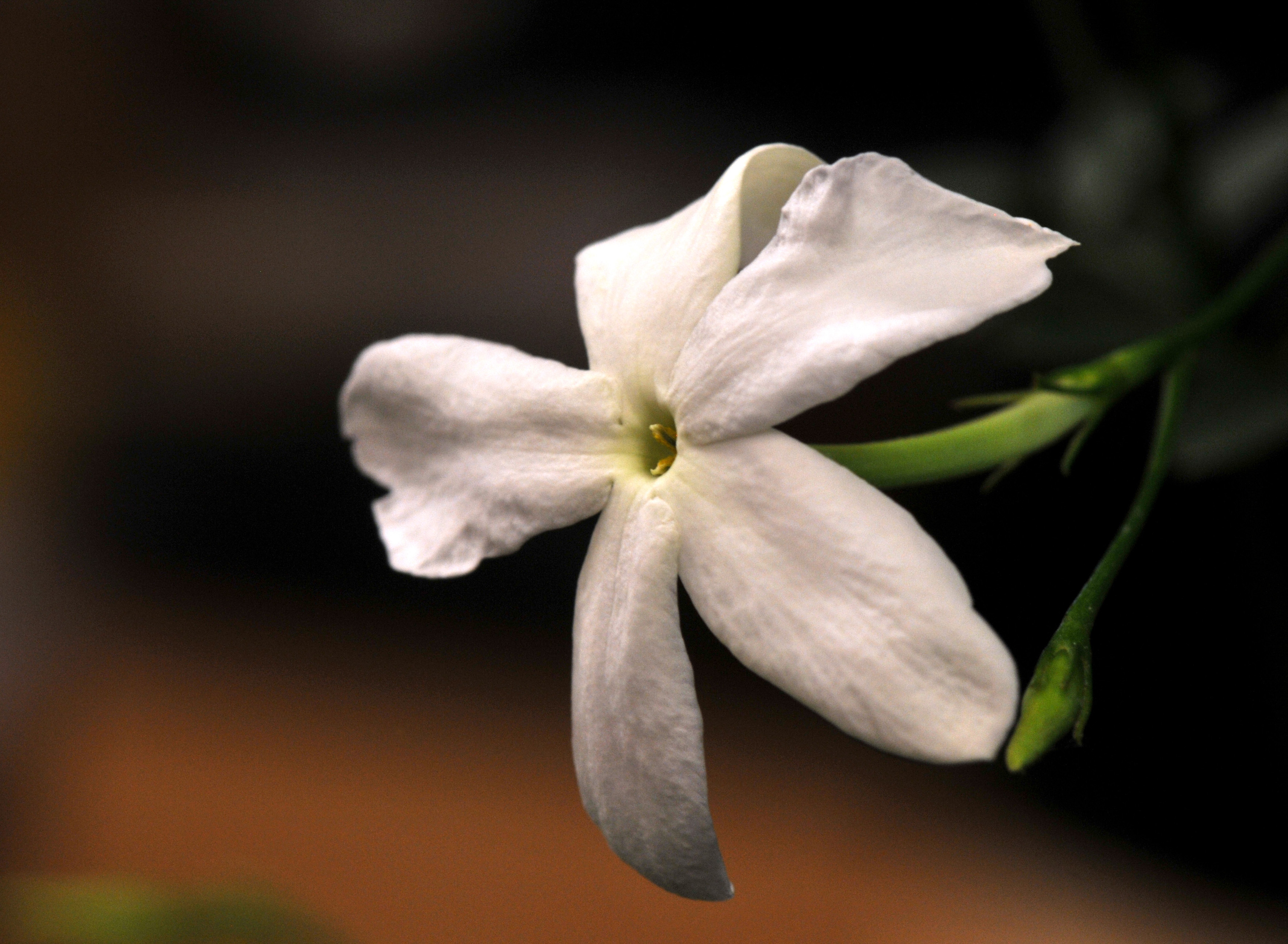Jasmine ‘Poet’ (Jasminum grandiflorum) loves cooler temperatures and started to bloom profusely outside, but it continues to bloom down in the basement.