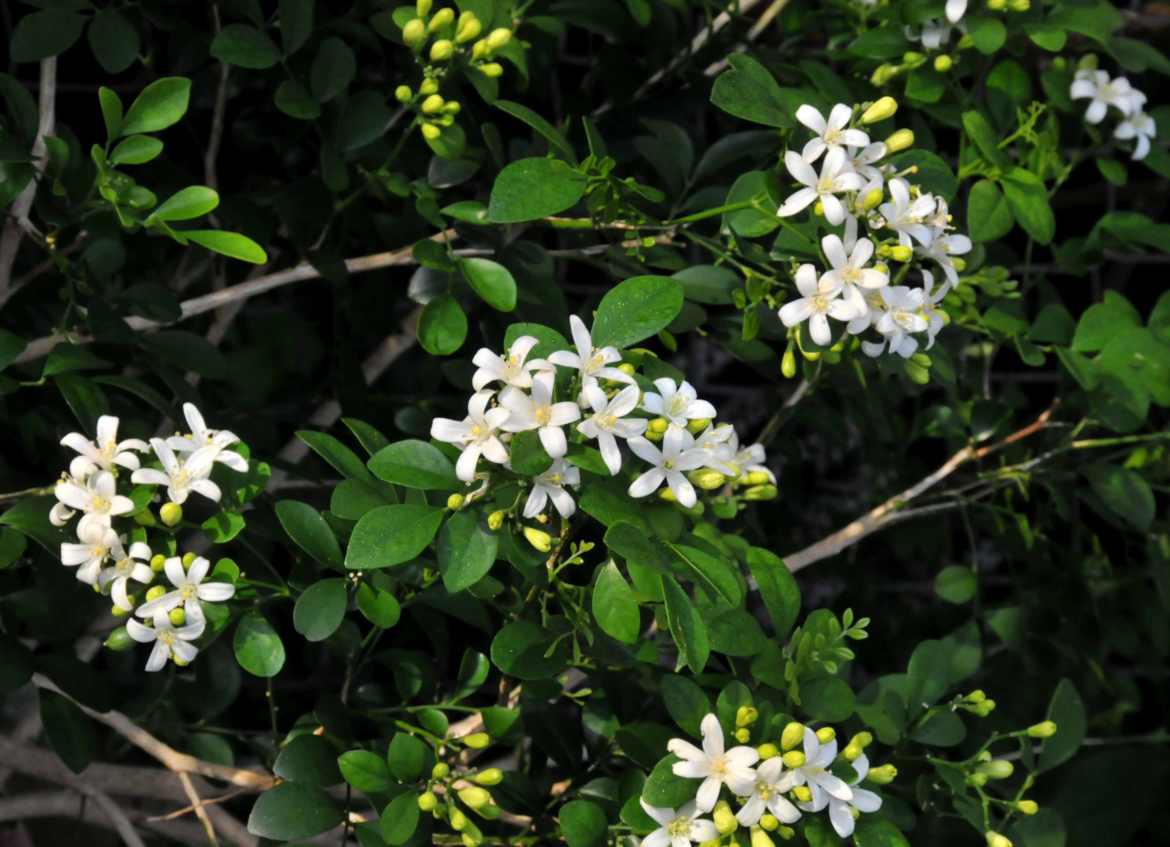 I took this Orange jasmine (Murraya paniculata) photo back in June when it enjoyed sunlight outside.  It still blooms here and there until sometime in the middle of winter when it will bloom heavily again.