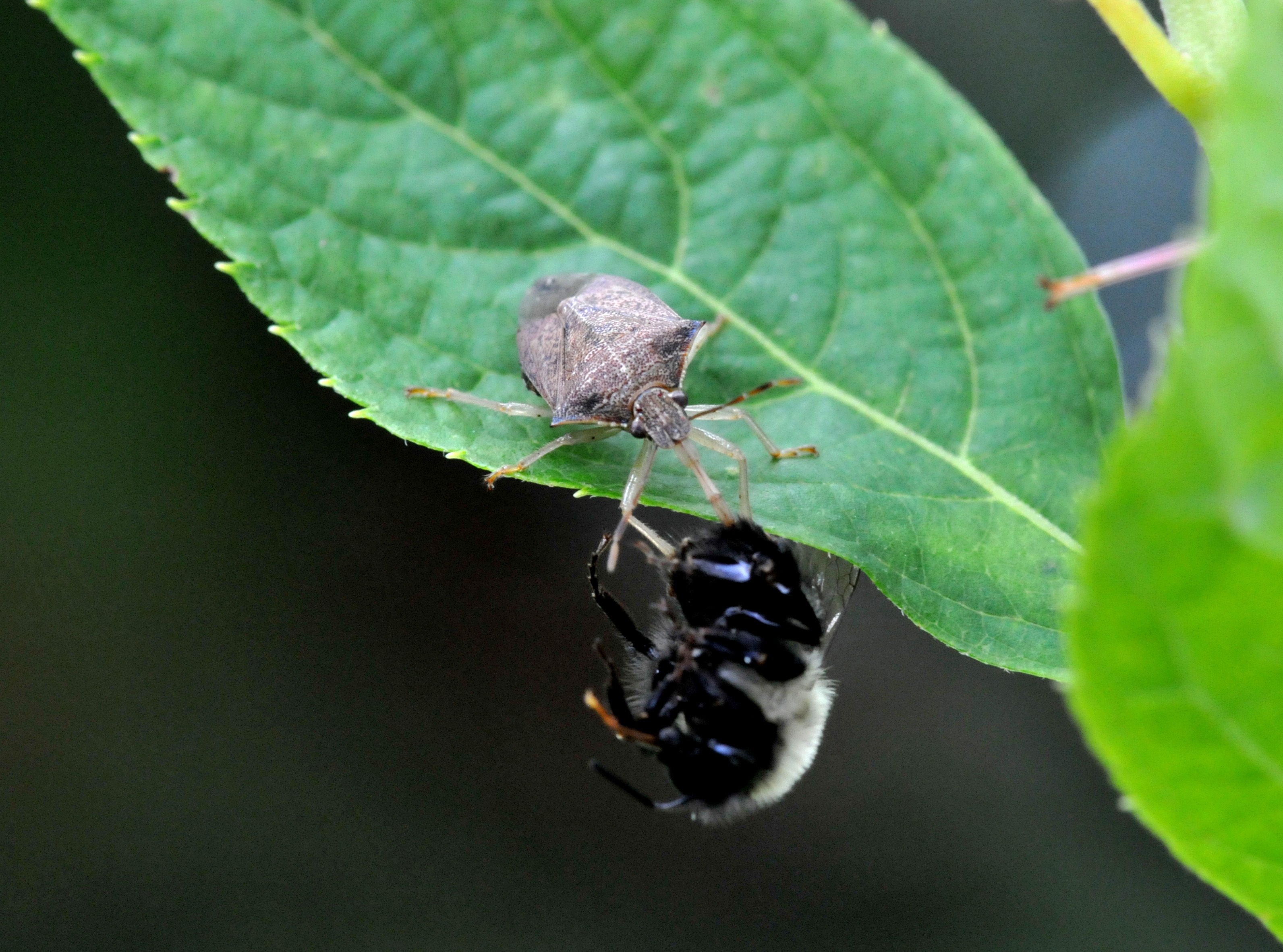 Spined Soldier bug nabbed a bumblebee, a good guy, but they nab the bad too