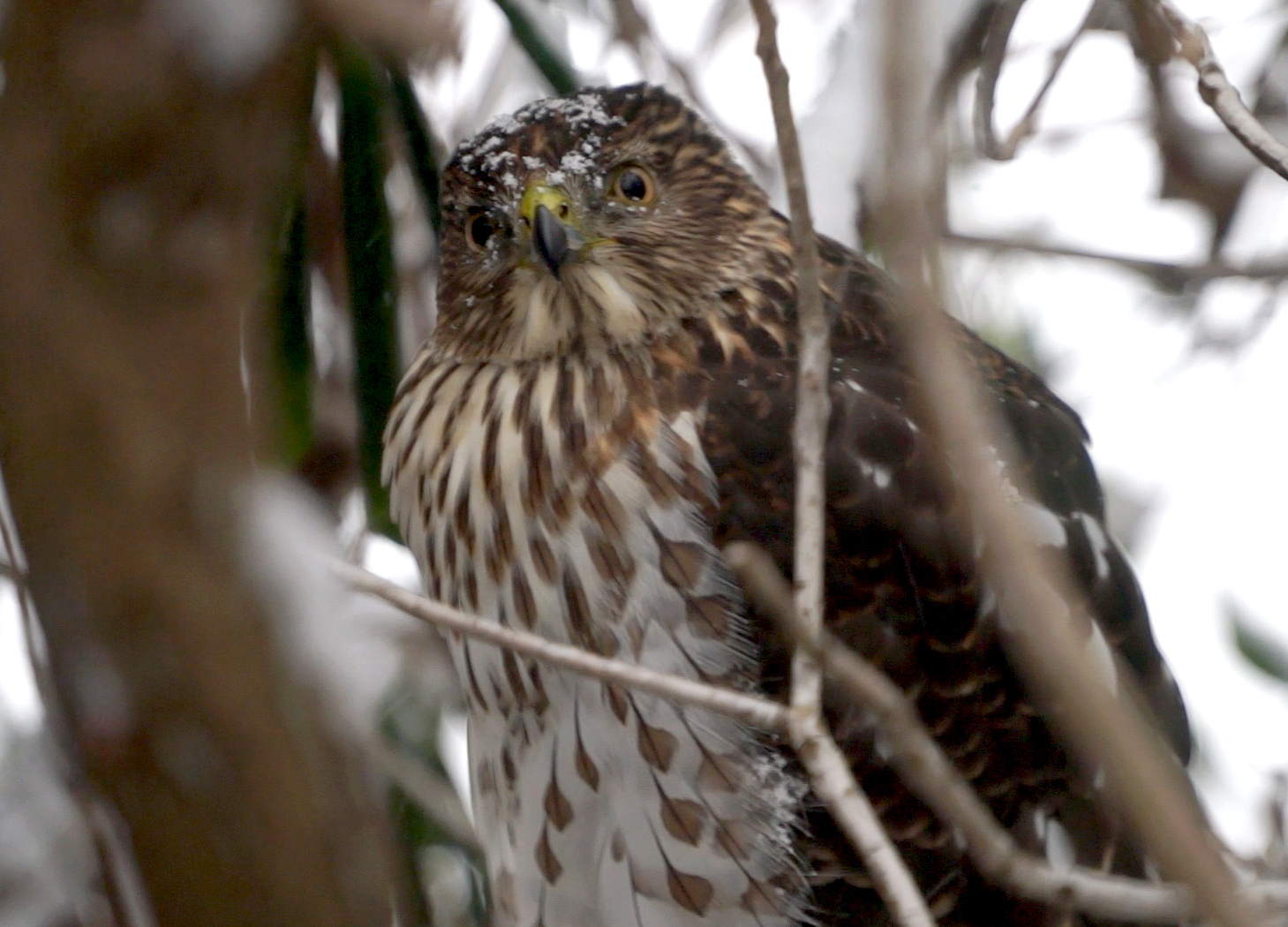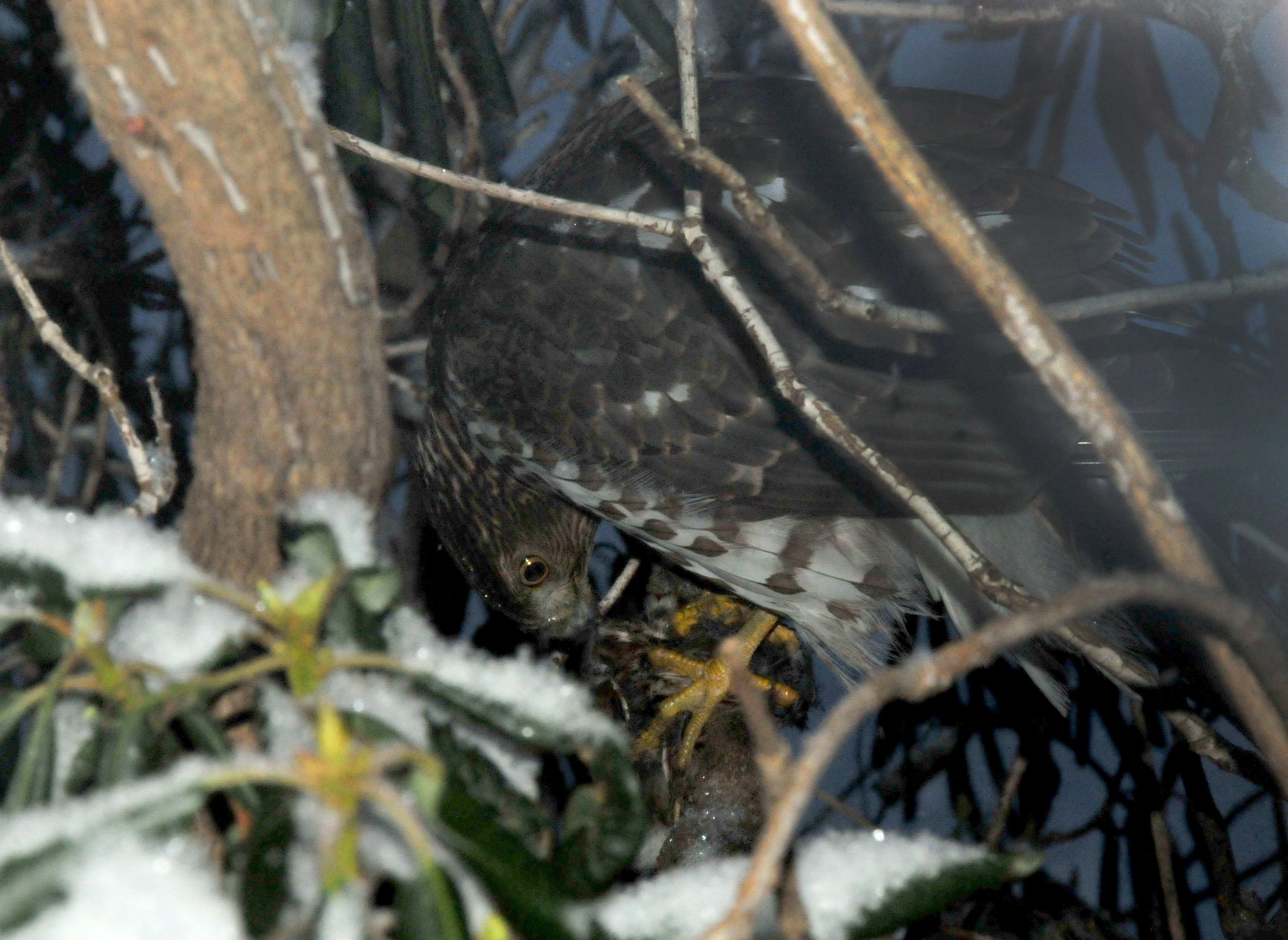 It snowed again today.  There was some snow on the ground when I woke up and it continued to snow all day.  I looked out the kitchen window while getting water for the coffee machine and saw the commotion in the garden.  All the small birds scattered, dashing for cover, while a hawk flapped his wings like crazy in the Himalayan Musk rose bush.  He probably chased some tasty birds in there and got caught between thorny branches.  This was not the first time I saw a hawk dive after a bird into a bush.  This one seemed to be a Cooper’s Hawk (Accipiter cooperii).  I was surprised to see a hawk hunt this early in the morning, yes, it was around 7 am, let alone while it’s snowing.  The visibility is not good for them.