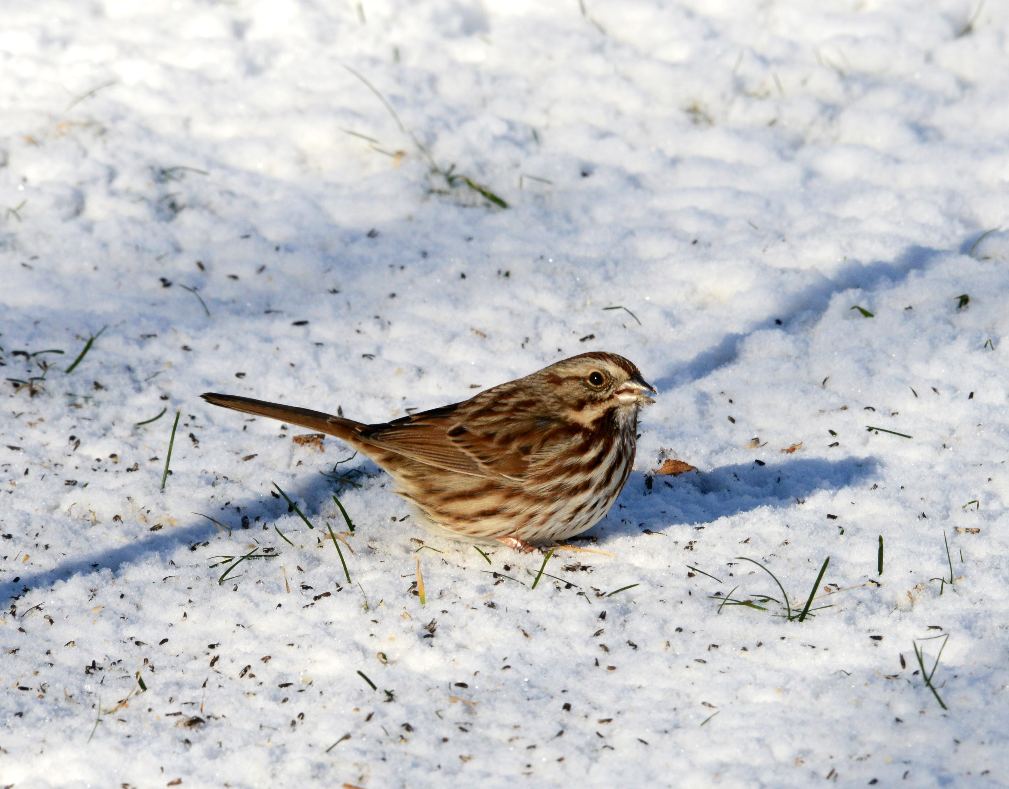 Song Sparrow (Melospiza melodia) has plenty of dark brown streaks on the breast and a dark spot in the middle of the breast. I mistake them for Fox Sparrow (Passerella iliaca) many times when I try to identify sparrows. I’ve since learned that the Fox Sparrow is a little larger and their color is more of a rusted brown. I saw two or three Fox Sparrows in early fall but haven’t seen them since.