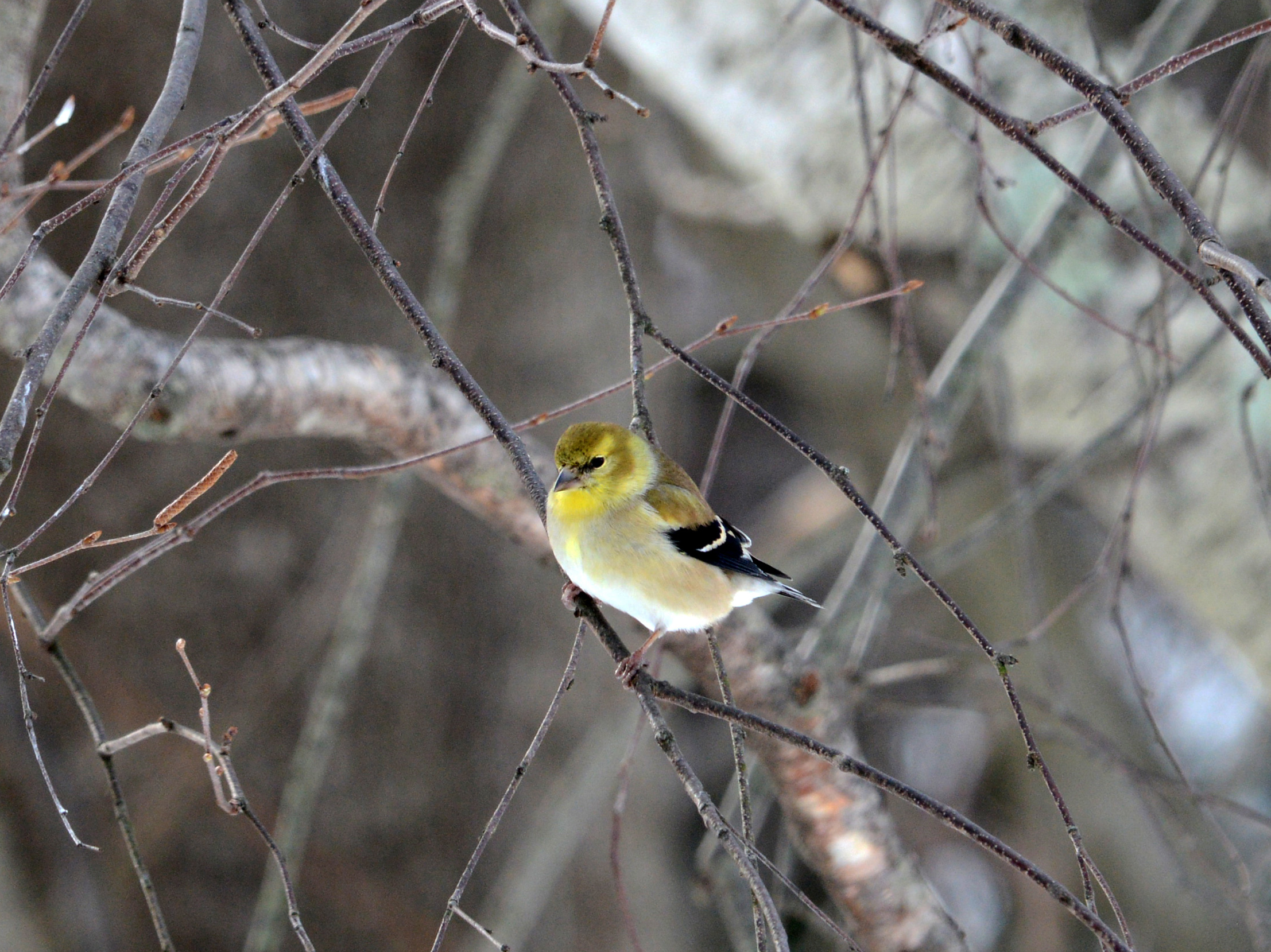 The American Goldfinches (Carduelis tristis) are starting to shed their winter coats. There are little bits of yellow tipped grey down here and there on the snow, and the birds are beginning to show spring colors in bright yellow blotches.