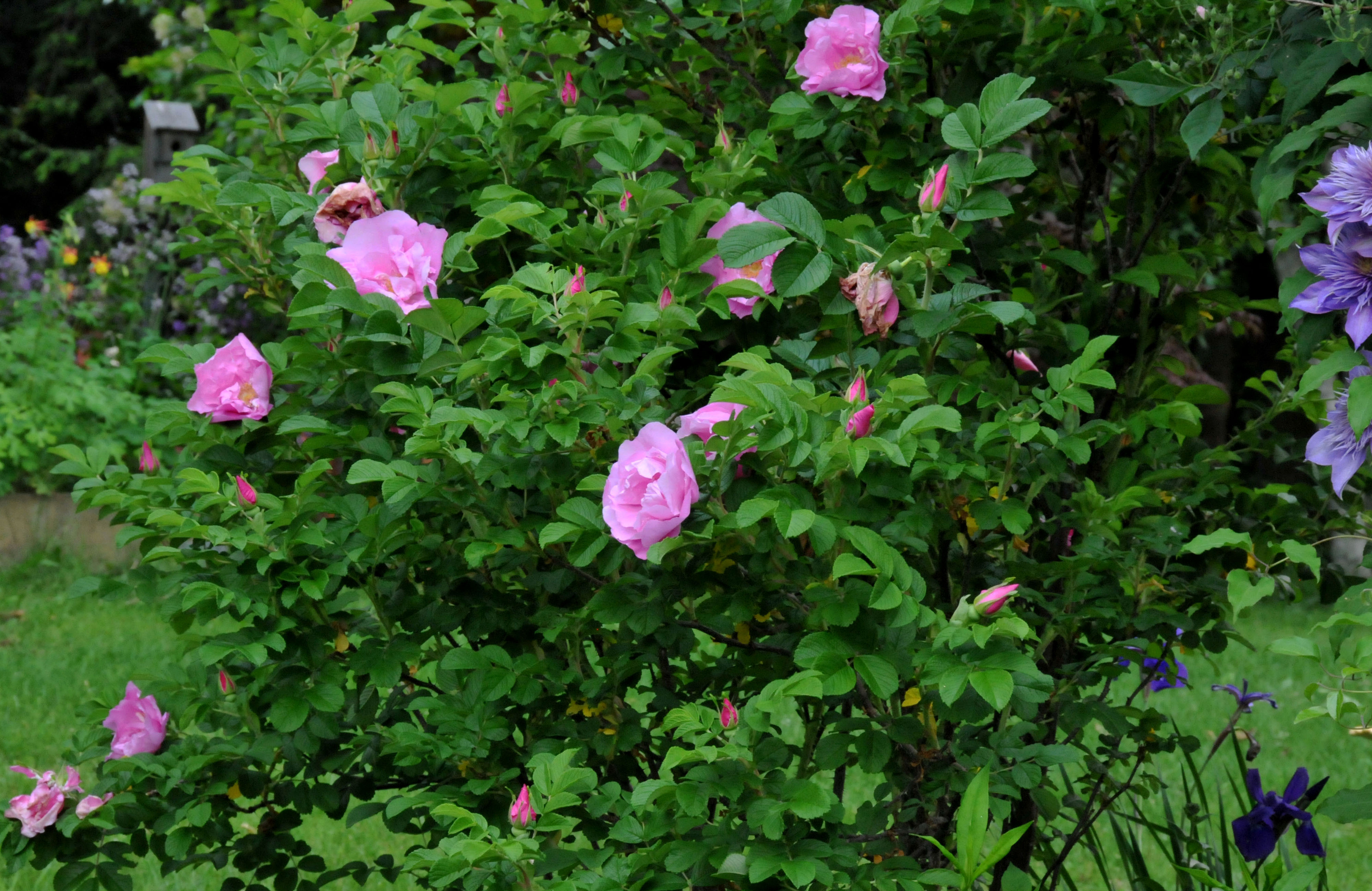 Rugosa roses are also bee friendly, both bumble bees and honey bees, love them.