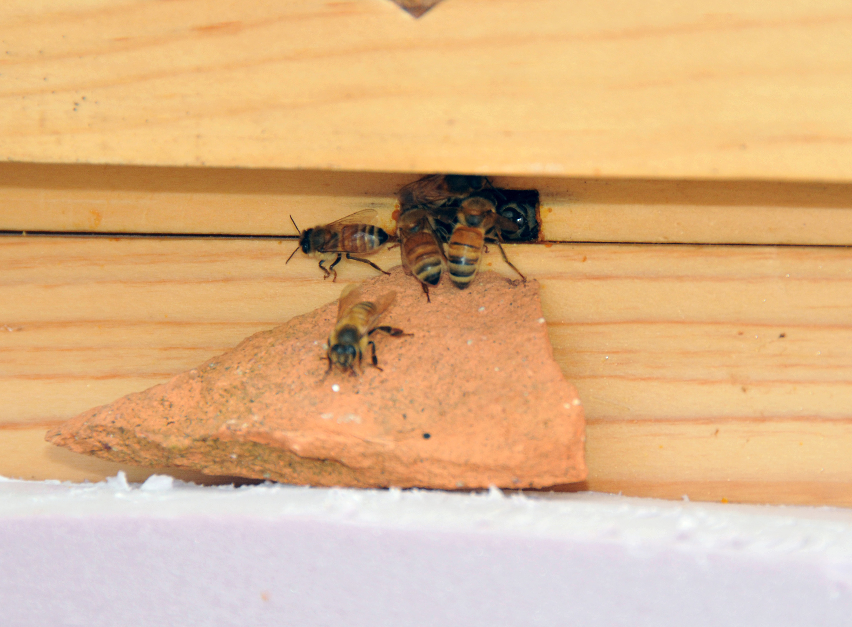 Then the third hive, the smallest one, appeared.  I didn’t expect them to survive as they were the weakest with the least honey in storage.  But they did.  The majority of them seemed to like using the top entrance.  The ones that came back with pollen had difficulty climbing up to the entrance so I put a piece of broken clay pot in as a ramp.