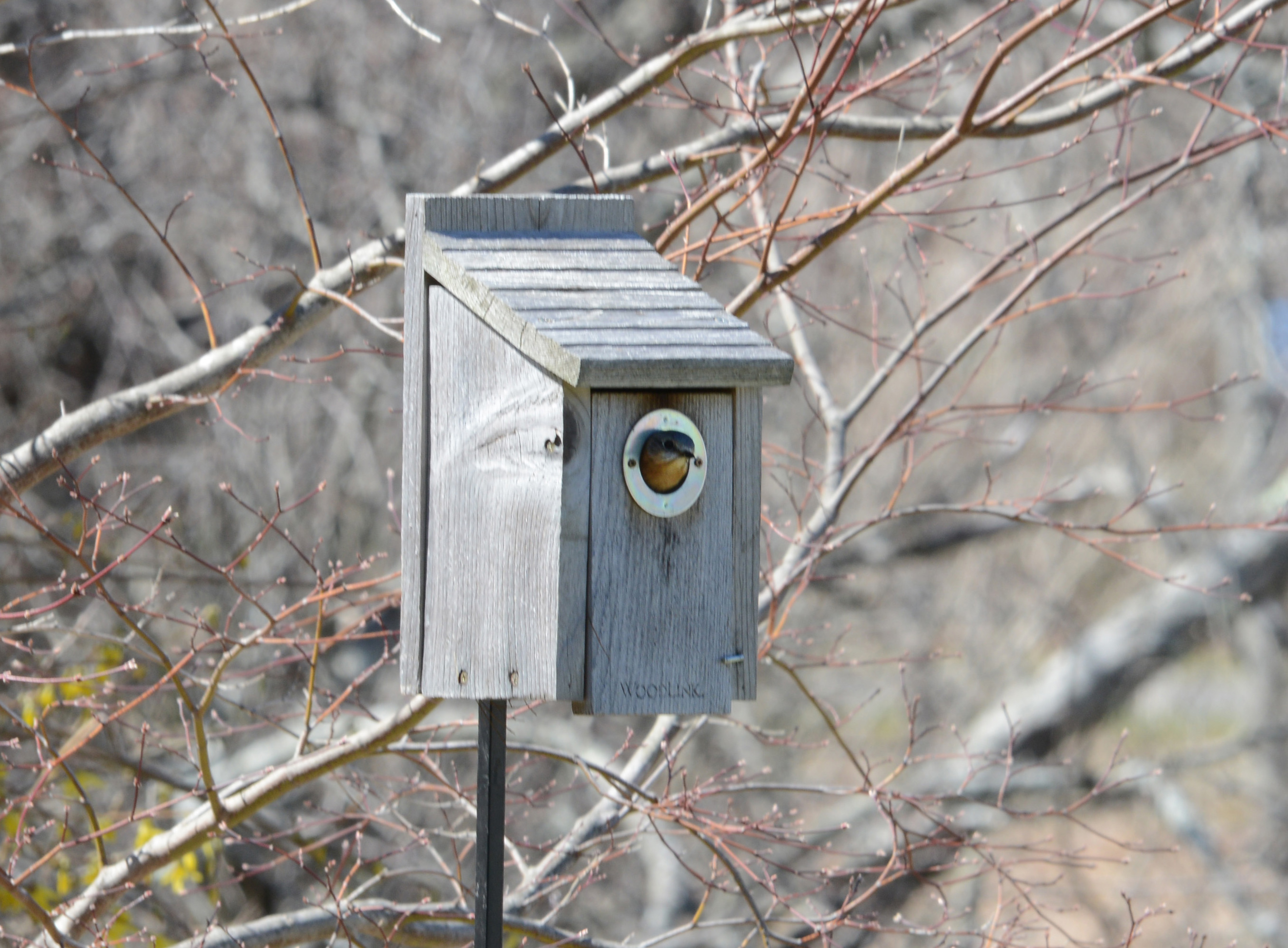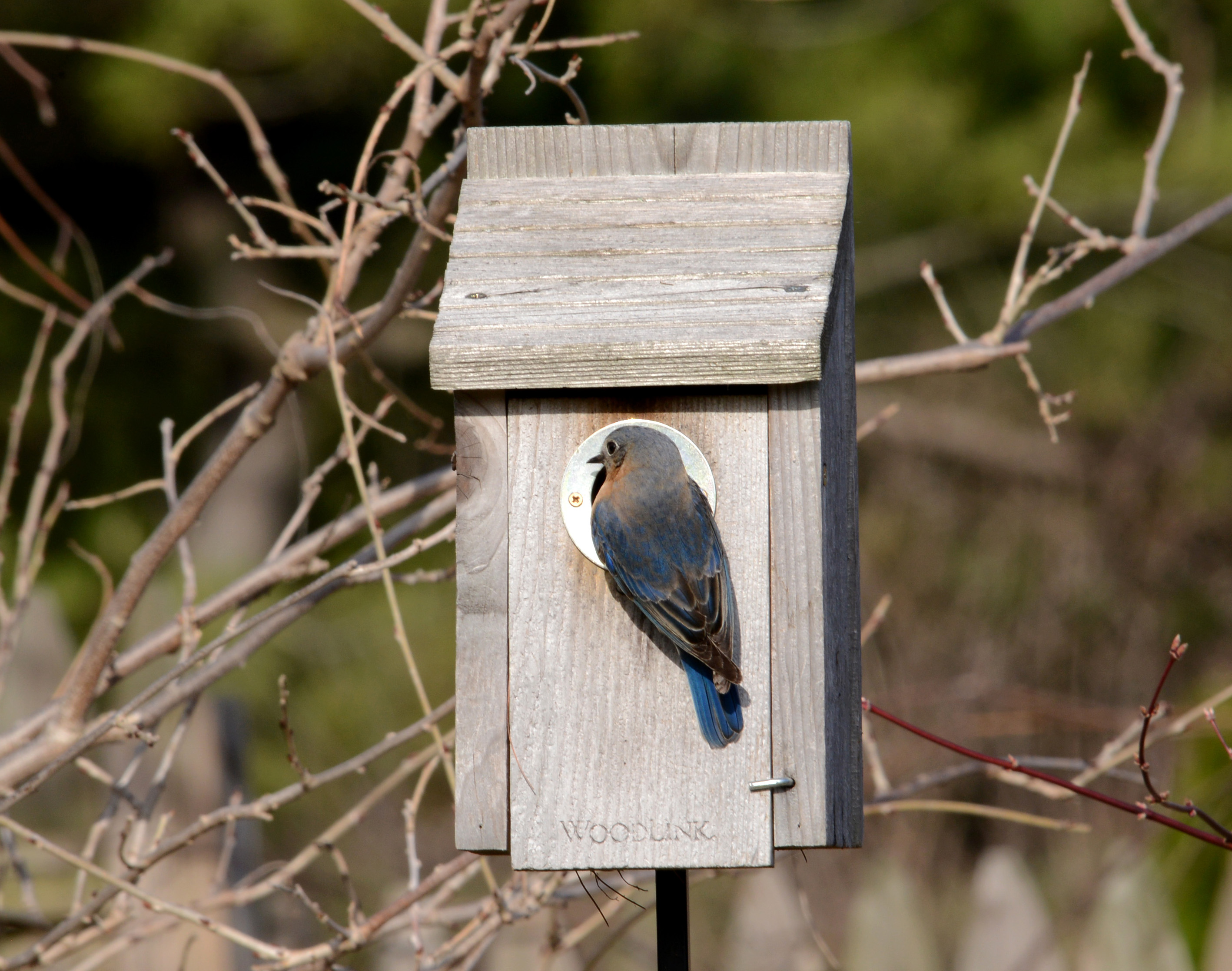 However bad this last winter was, the Eastern Bluebirds (Sialia Sialis) elected not to leave us for warmer digs down south. Maybe because we provided everything they needed here: food, water and places to roost inside from the cold wind and snow. This last winter was the first time that they were really present on an almost daily basis. Once the weather started to get warmer, they started to seriously look for a place to nest. From an initial flock, there are only four left now. They have made their territorial claims. I don’t know whether the pair that is nesting in one of the nest boxes now is the same pair that nested in there last year. I was unable to find any information on whether they try to nest at the same place every year as the Tree Swallows do.