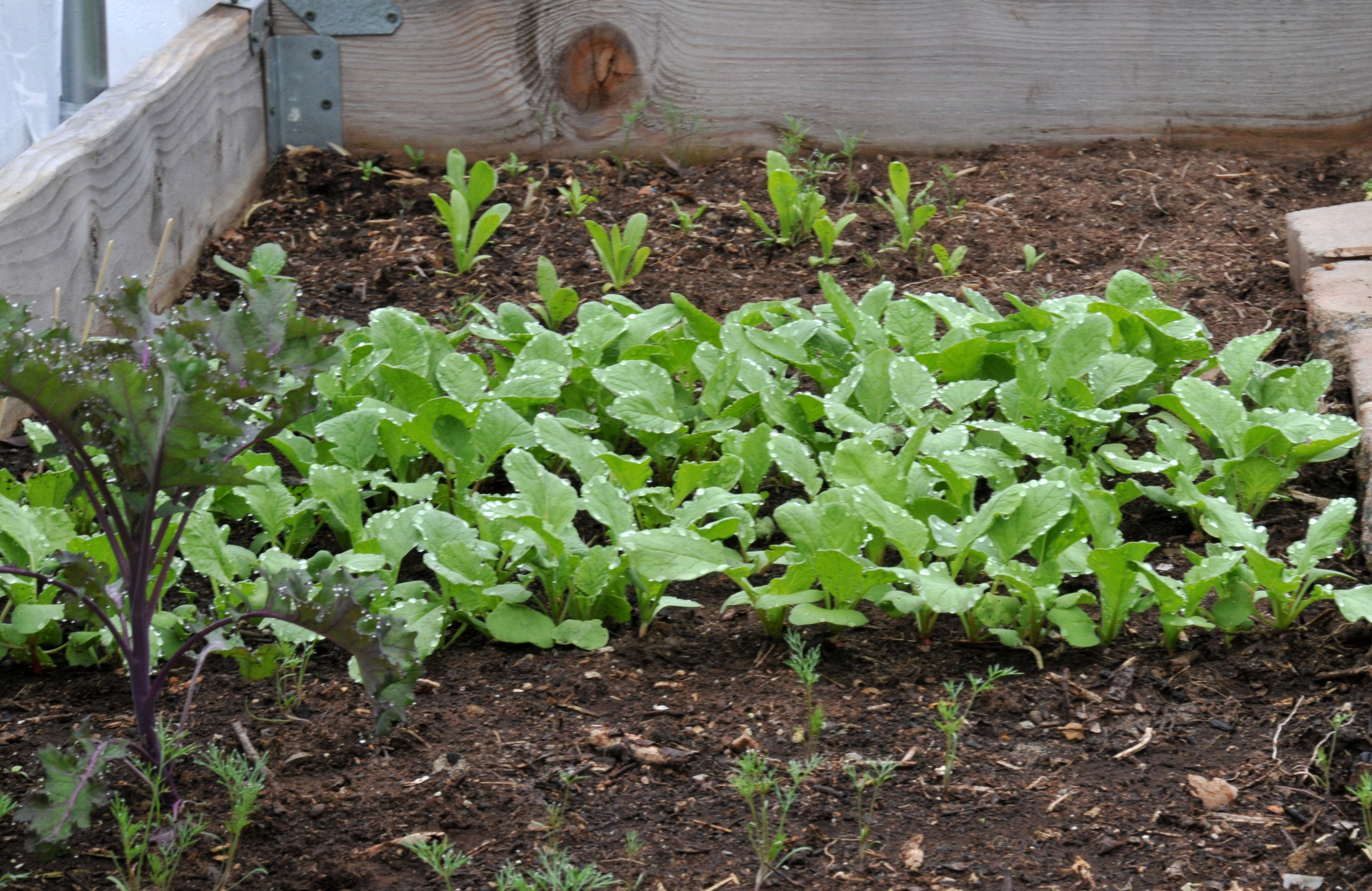 The weather is still unpredictable. Temperatures have been swinging between 70ºF daytime and a low around 40ºF at night. It’s still too cold for many vegetables to germinate outside, but I have sown scallion, Mustard ‘Dragon Tongue’ and Oakleaf lettuce in the plot outside the cold frame and it seems to be taking them a little bit longer to sprout. But I can wait as I still have a lot of vegetables to pick from in the cold frame.