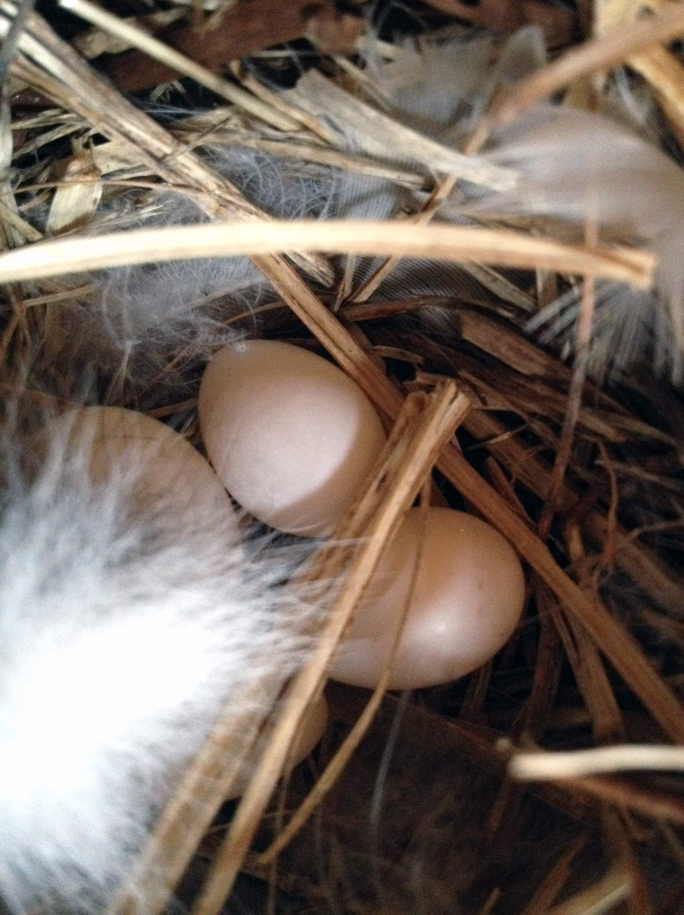 The Tree Swallows that nested in the box by the vegetable garden have finished building their nest, lined with white feathers and down picked from the lake nearby. In less than a week, there are four white eggs laying comfortably in it. The female is so used to me being in the vegetable garden now that she just sticks her head out to look at me when I’m right by the box. If I continue working, even right below her nest, she just disappears back inside. Once in a while she would come out to stretch on top of the pole in front of the nest box. It’s a comfort to have her keeping me company while I’m working.