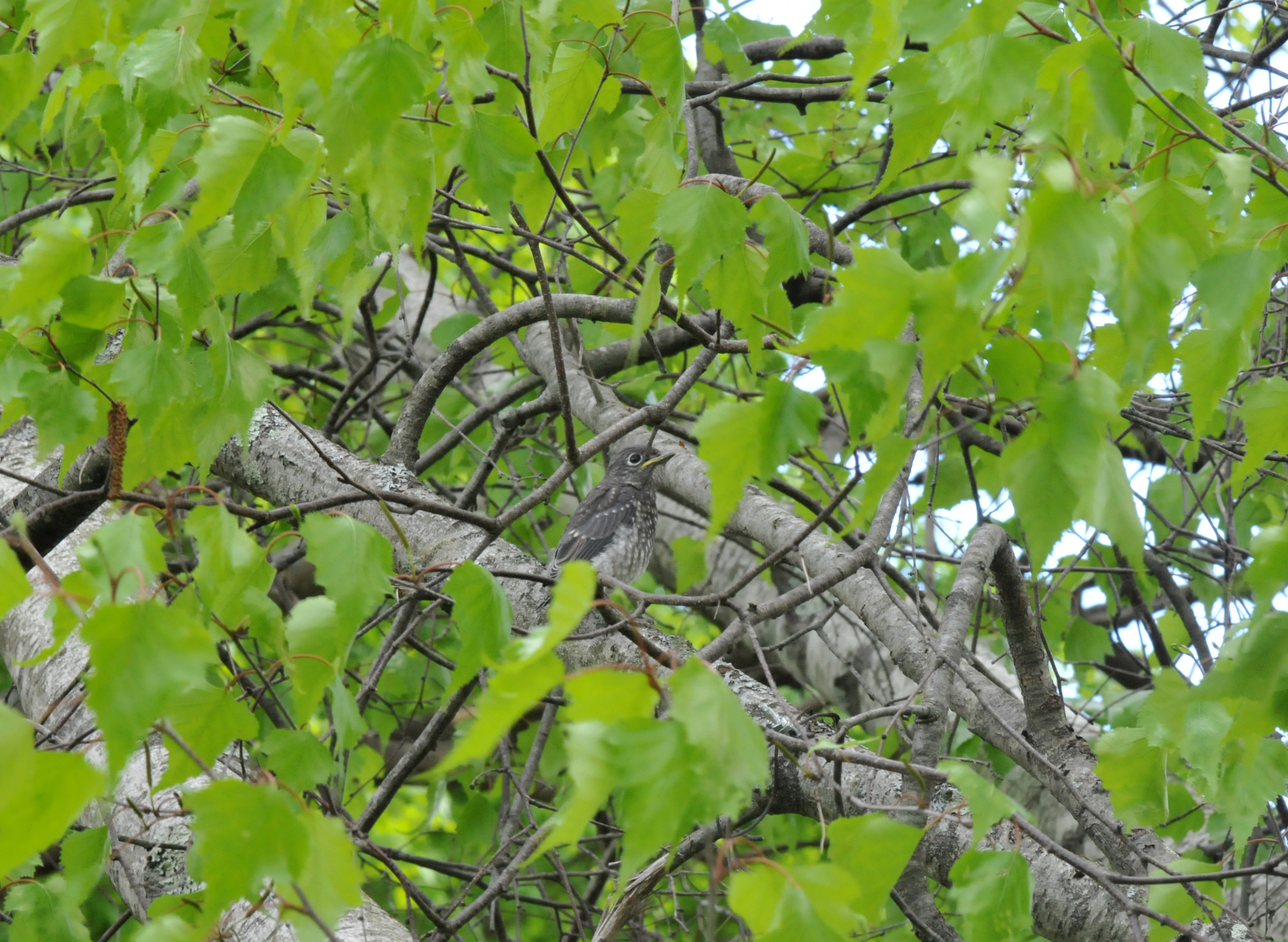It was very windy and a little cold last Monday, felt almost like a cold front was coming in.  I limp along in the garden due to a golf ball sized bruise swelling on my right shin. Why?  Tripped on a cement block in the garden while looking up when I should have been looking down.  Despite the wind, it was a very nice day.  It was sunny and staying inside to nurse my shin would have been a waste of a perfect day.  I dug up, replanted and pruned plants in the garden and whatever needed to be done without heavy lifting.  In the middle of all these tasks, I heard the Bluebirds call too many times above my head.  I realized that the parents were encouraging a baby to fly by calling it from different branches.  I looked up and found one of the chicks perched quietly on a birch branch near by.  He flew from branch to branch following the calls.