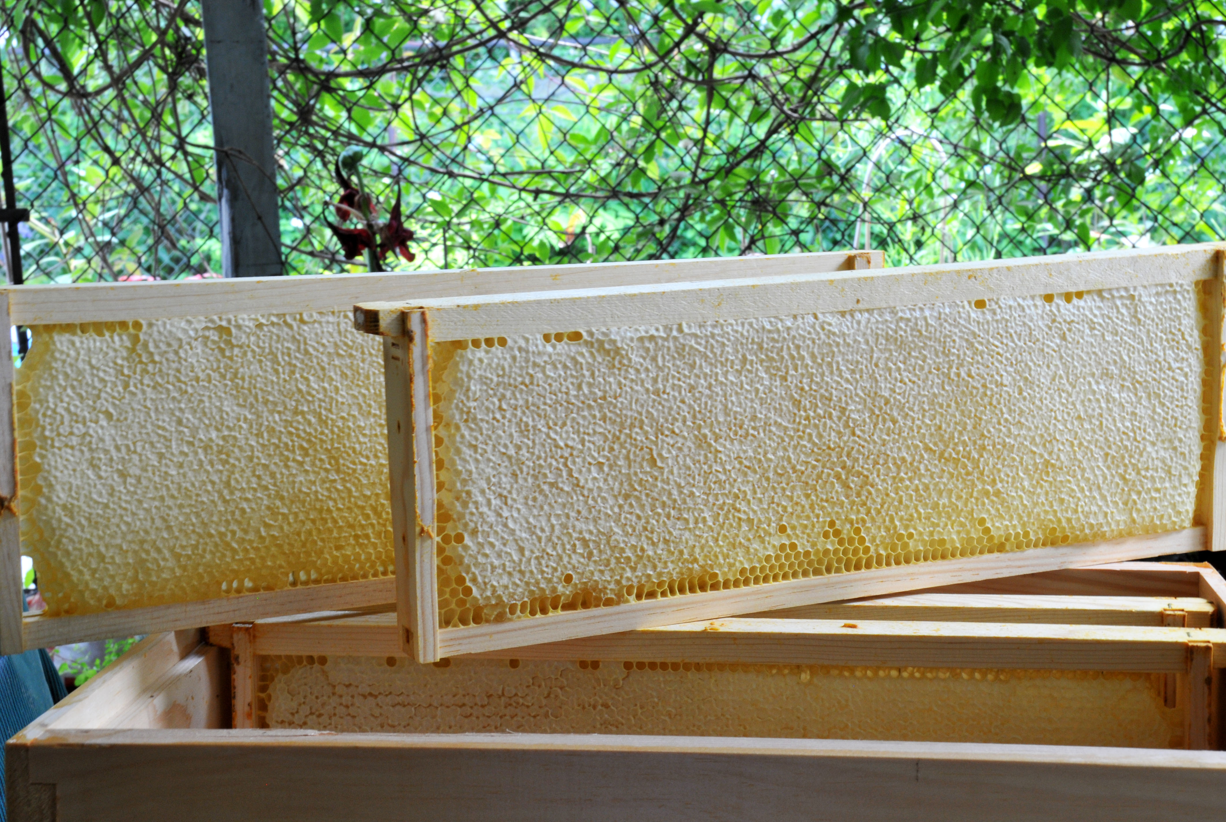After I finished with the swarm I inspected the original second hive. This time I had no mercy. I removed all the queen cells, two had already opened anyway, to prevent further swarming. All frames in the super above the queen excluder were filled with honey. So I removed four of them that were completely sealed, left the one that was partially sealed in there for them. The bees punished me with four stings. It really wasn’t their fault, I was robbing them of their food supply and I wore only a t-shirt, veil and gloves.