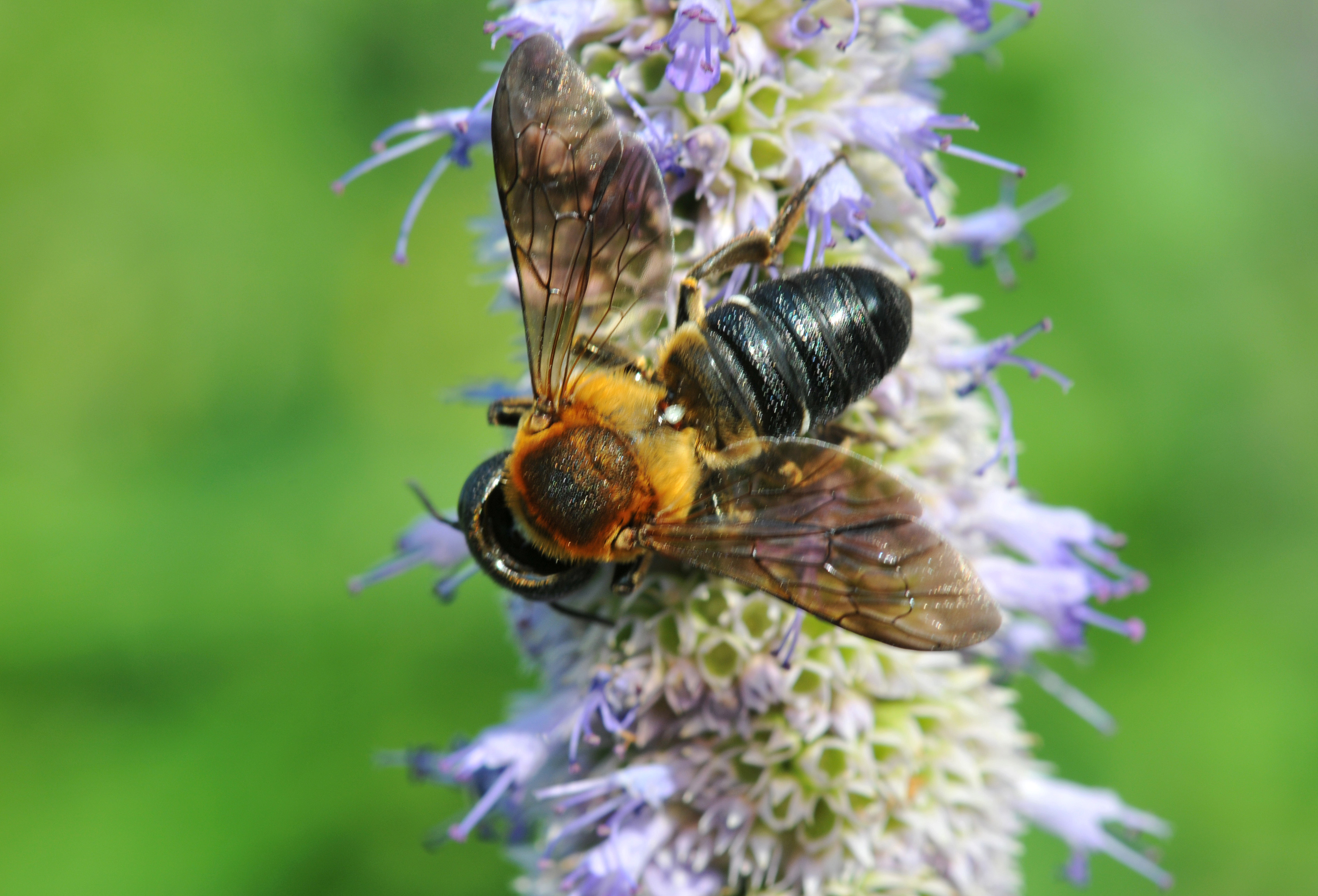 This time of year is when Anise Hyssop blooms, and I have a whole patch of them. The bees were busy from early morning onward and I enjoy watching them. To my surprise, this giant showed up this summer. Two of them as far as I know, since I’ve seen them working on two different patches at the same time. They are Giant Resin bees (Megachile sculpturalis).