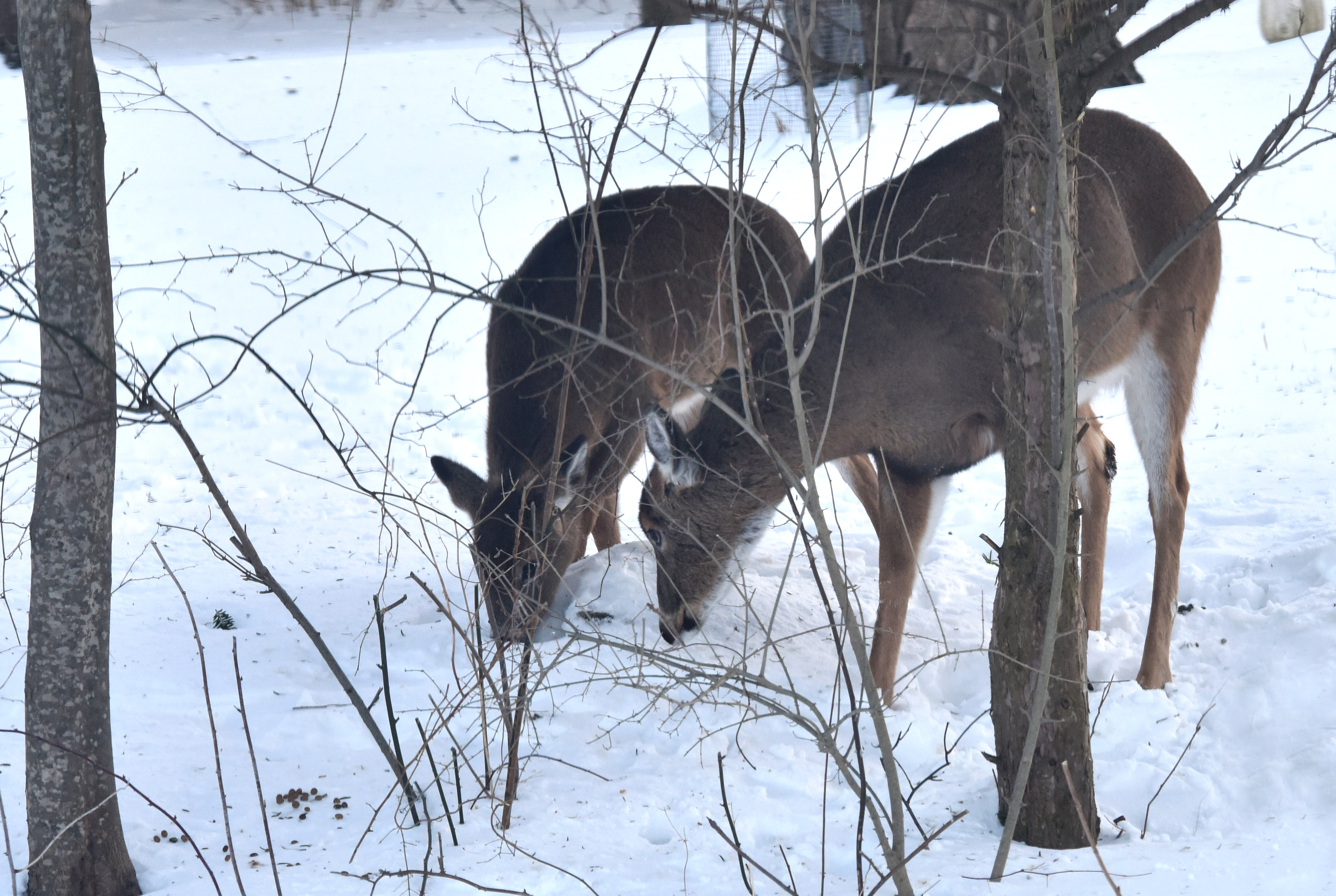 White-tailed deer are common in our area.  Five or six of them at a time frequent the garden at dusk and late night.  At this point they eat anything they can get their teeth on: Hydrangea branches, Yew hedge and Rhododendron.  Last year they chewed our Blueberry bushes down to the stumps so we netted them this year.  They also learned to shake the green bird feeder to knock the seeds out.
