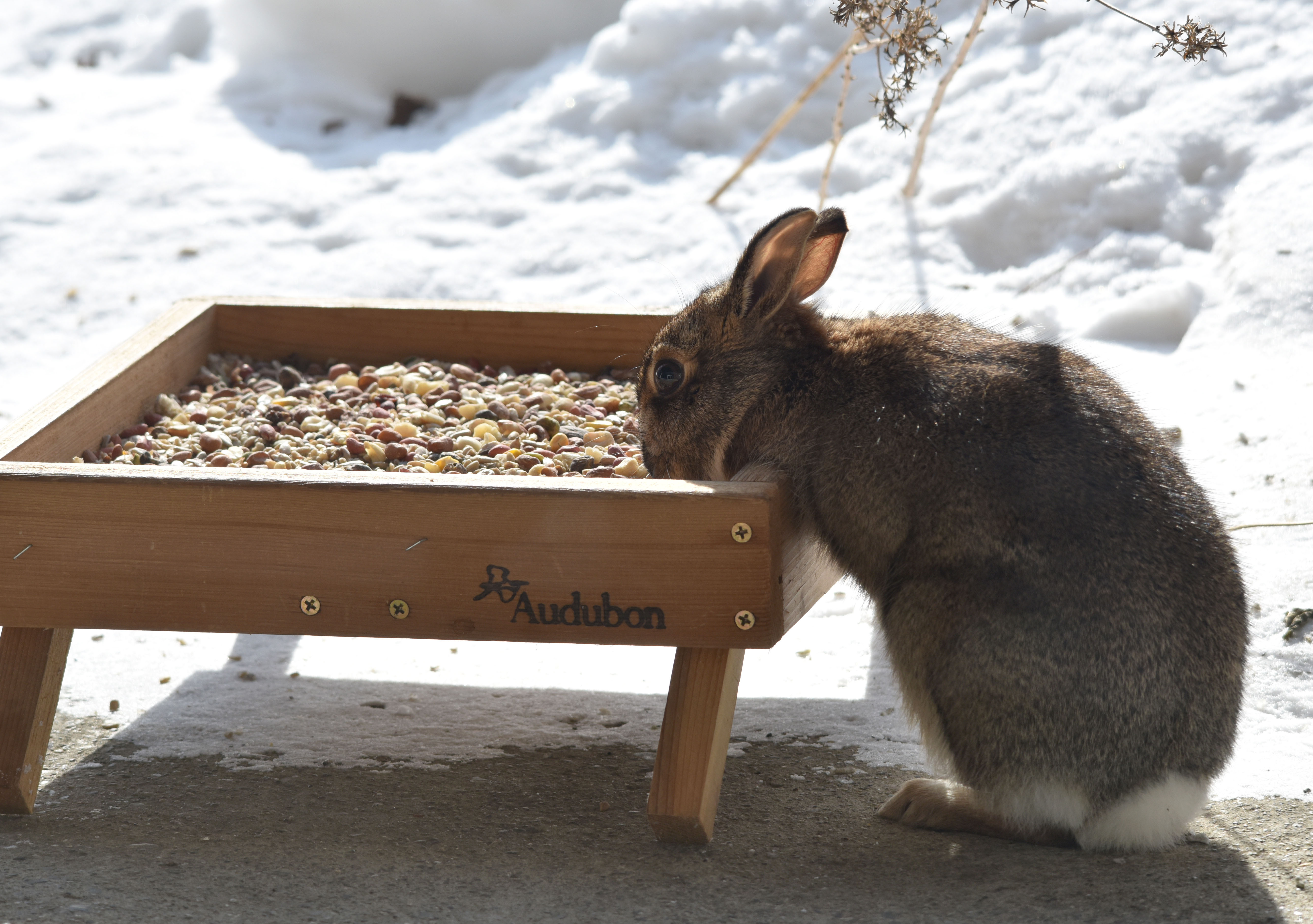 We have plenty of wild rabbits as well and we let them be when they behave.  That means when they eat only weeds on the lawn.  This rabbit came to eat dry mint on the patio.  Yes, mint…one of a few plants that neither deer nor rabbit eat in general.  Then he moved to the bird feeder.  After munching for a few minutes, he relaxed to soak up some sun near by for a couple of hours and then returned to munching seeds.  He had no fear of me even when I was a couple of feet away.  We wondered if he’s the same young rabbit I rescued from the swimming pool last summer.