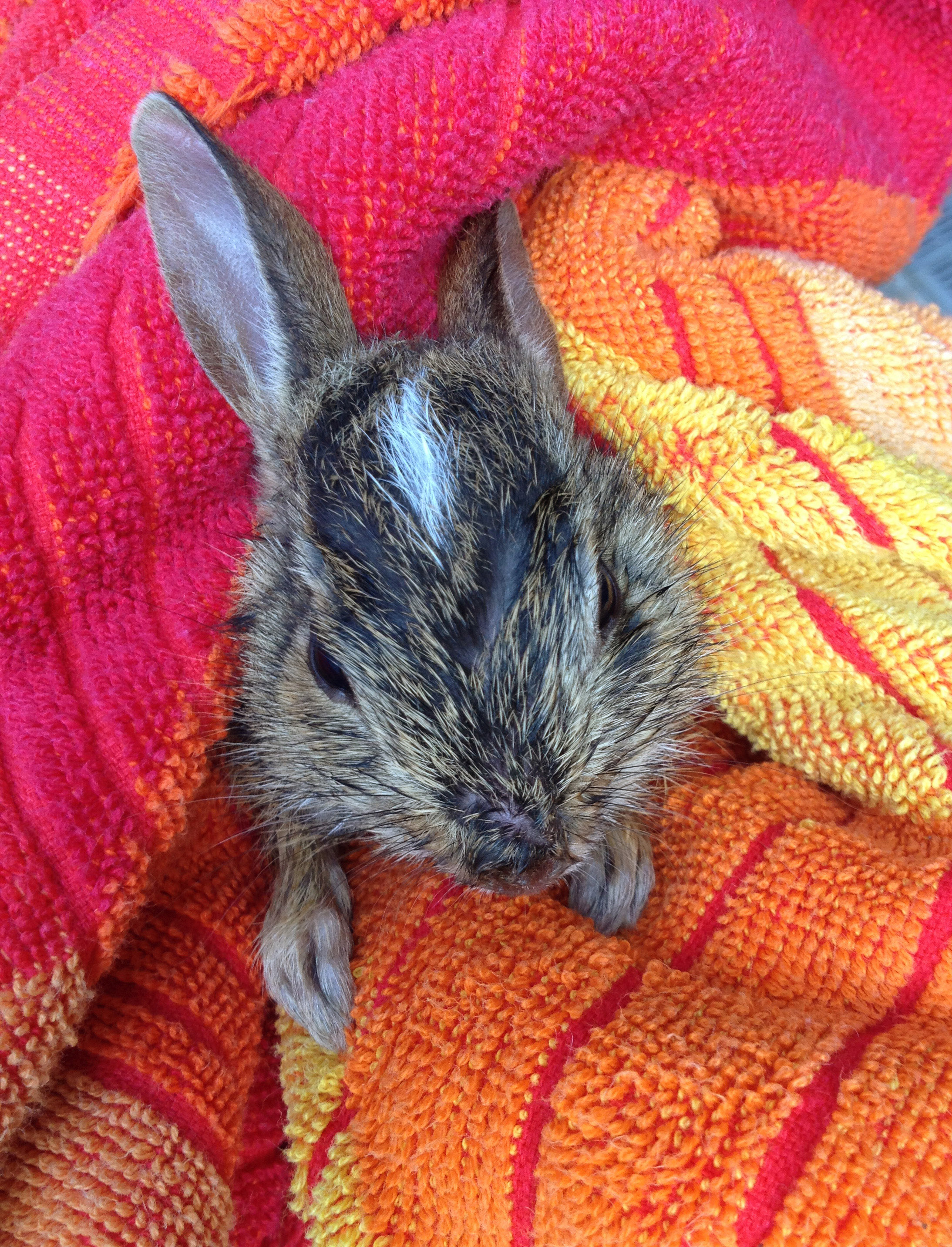 I rescued this young rabbit (always has white mark on the forehead) from our swimming pool.  I found him swimming laps one morning.  Fished him out, washed chlorine off, pat dry and held him in a towel until he stop shivering then let him go back to his mother.  After this episode, we found a rabbit that acts like he owns our garden.  He would just step out of my way but never run and hide.  So we wonder if he’s the same one who came to eat on the patio.