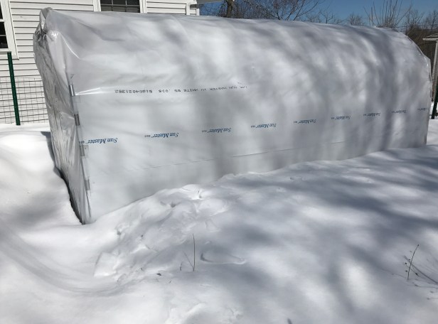 We had around two feet of snow last Tuesday and most of it is still on the ground. The daytime temperatures are hovering between 30 and 40°F which isn’t helping to melt it. Today is the official first day of spring but outside, you would never know it. It’s more like ‘Hello spring, where are you?’ to me. Crocuses, Hellebores and Snowdrops were completely buried under. My little cold frame looks more like a little igloo in the garden.
