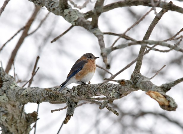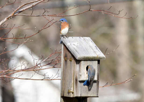 The first pair of birds that took up residence in our garden this year is the Eastern Bluebird.  After picking and choosing among several nest boxes in the yard, they ended up at the same one the bluebirds nested in last year.  I’m not sure that it’s the same pair though, since a flock of them stayed with us this winter.