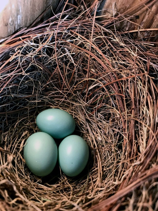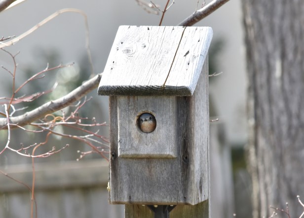 Once the female has started to lay eggs, the male become very territorial.  A Tree Swallow who just migrated back, checked the nest box for availability and was immediately chased away.  As aggressive as the male bluebird is, he’s no match to the House sparrow.  We have to diligently monitor all the nest boxes in the garden for signs of the House Sparrows.  So far we have been successfully hosted Eastern Bluebirds, Tree Swallows, House Wrens, Chickadees and Tufted Titmouse in our nest boxes by monitoring the House Sparrows attempts.