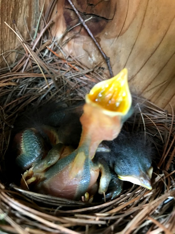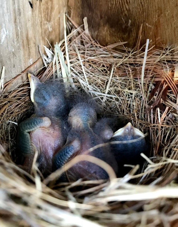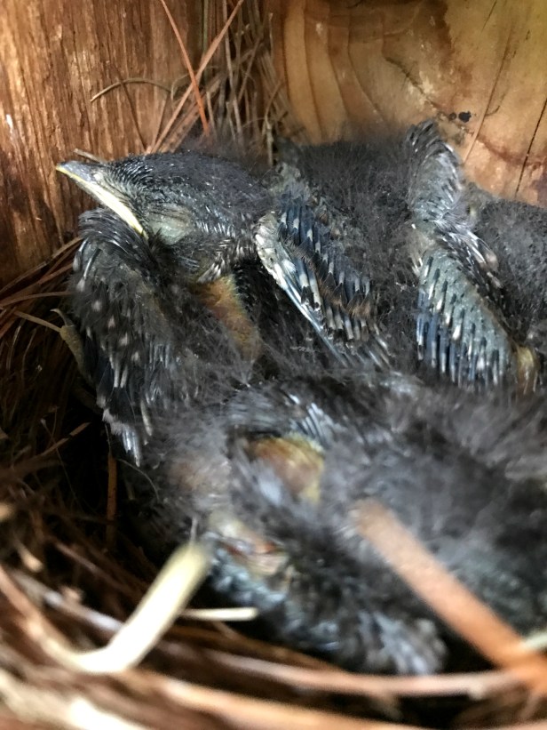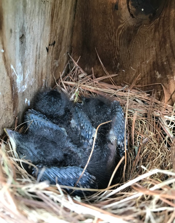 In the years past, we have only observed Bluebirds raising one or two broods at the most. Then to our surprise & excitement, we discovered a third brood in the front yard. I have seen the Bluebirds on this nest box a few times but have also seen House sparrows (Passer domesticus) on it too. The vicious House sparrows zoom into their nests, peck & break their eggs & will not let them have any peace. However when we tried to trim the hedge by the nest box, the Bluebirds wouldn’t leave the area so we checked the box. Bravo! What a pleasant surprise and hedge trimming was immediately suspended.