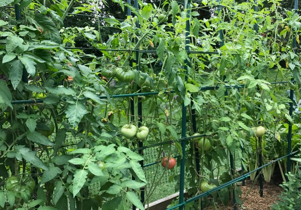 We love tomatoes and have been growing a variety of both large and small sizes. The challenge of growing tomatoes for me is keeping them straight up. I bought a variety of tomato cages early on but they never worked well for me. Most of the time they’re too short. My tomato plants grow over six feet tall and some years I have to get on a ladder to tie them in place. So I have been experimenting with ways to keep them from flopping over in the least amount of time. Tying tomato plants is a time consuming process.