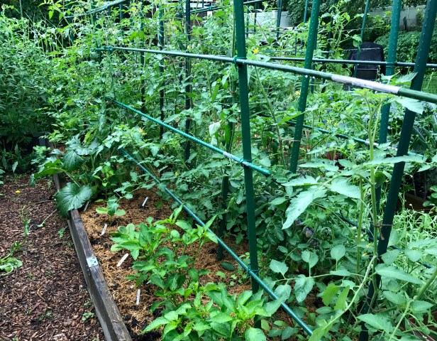 When the tomato cages failed, I used long poles to tie the main stalks up, then used some shorter and smaller ones vertically in between for the branches. This method worked well but risked damaging the roots when I pushed a new pole into the ground to support a branch. The tomatoes also flopped over when I failed to have enough time to keep tying them regularly as they grew. I also used a lot of smaller poles, too many of them, in fact. I had been using this method until last season.