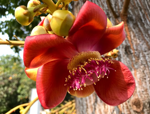 Sala (Couroupita guianensis) or Cannonball tree has quiet beautiful flowers that look like anemone.  The flower has very sweet fragrant. I wish I could grow it here.