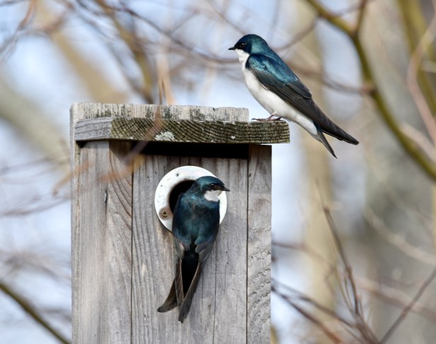We heard and saw Tree swallows that flew back from the Carolinas and only to be hit by snow the next day. They haven’t come down to check on the nest boxes yet. Hopefully they nest early enough and will not to be chased out of their usual nest box by the Bluebirds.