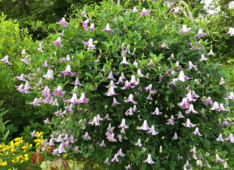 ‘Betty Corning‘ produce hundreds of small lavender flowers with a slight scent. The flowers look like small bells swaying in the wind. Bumblebees love them. This clematis seems to bloom forever once it starts to bloom. Ours bloom from late May to September. I cut it down to a foot and a half in late winter and feed it. Throughout the growing season, I keep cutting the spent flowers off so it will continue to produce new flowers.