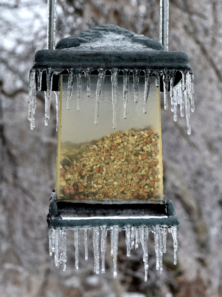 The weather forecast for a foot of snow last Sunday didn’t become reality however the temperature has dropped down to 0 Fahrenheit plus windchill factor of -20 Fahrenheit. Icy rain water from Sunday turned into solid ice on all surfaces. Our driveway, from which we cleared wet snow & slush off and salted, still became skating rink. Wherever I look there is either frozen snow or ice. Conditions like this are difficult for non-migrating birds.